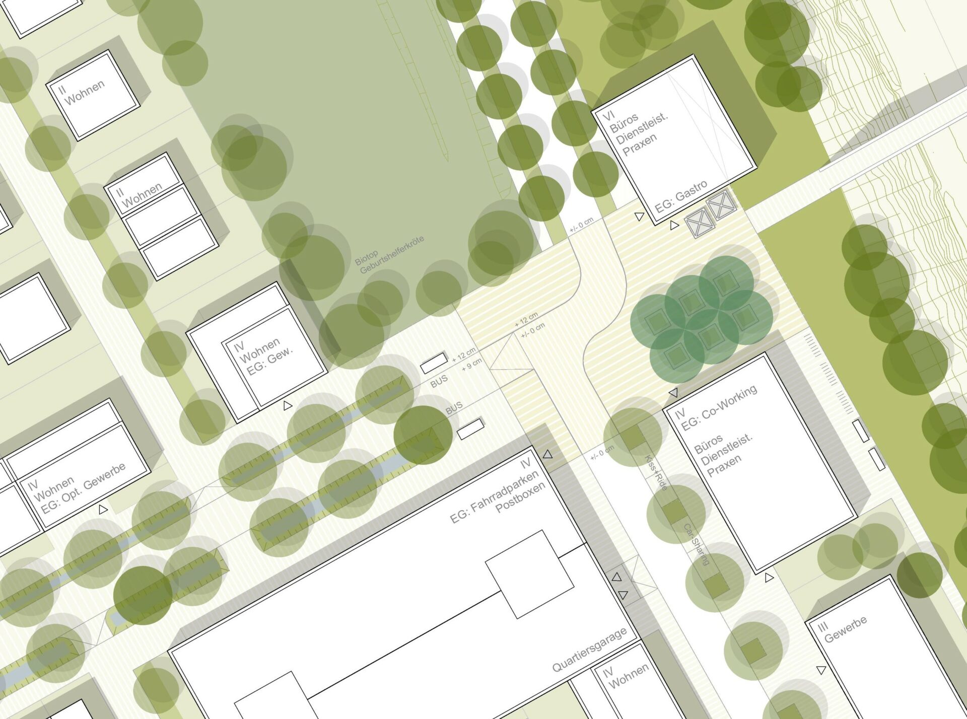 Straßenbegleitende Retentionsmulden im südlichen Boulevard sowie ein kleiner Retentionspark machen das Quartier resilient gegenüber Starkregenereignissen. Eine Biotopfläche im Nord-Osten wird wie selbstverständlich in den Grünen Saum mit integriert.