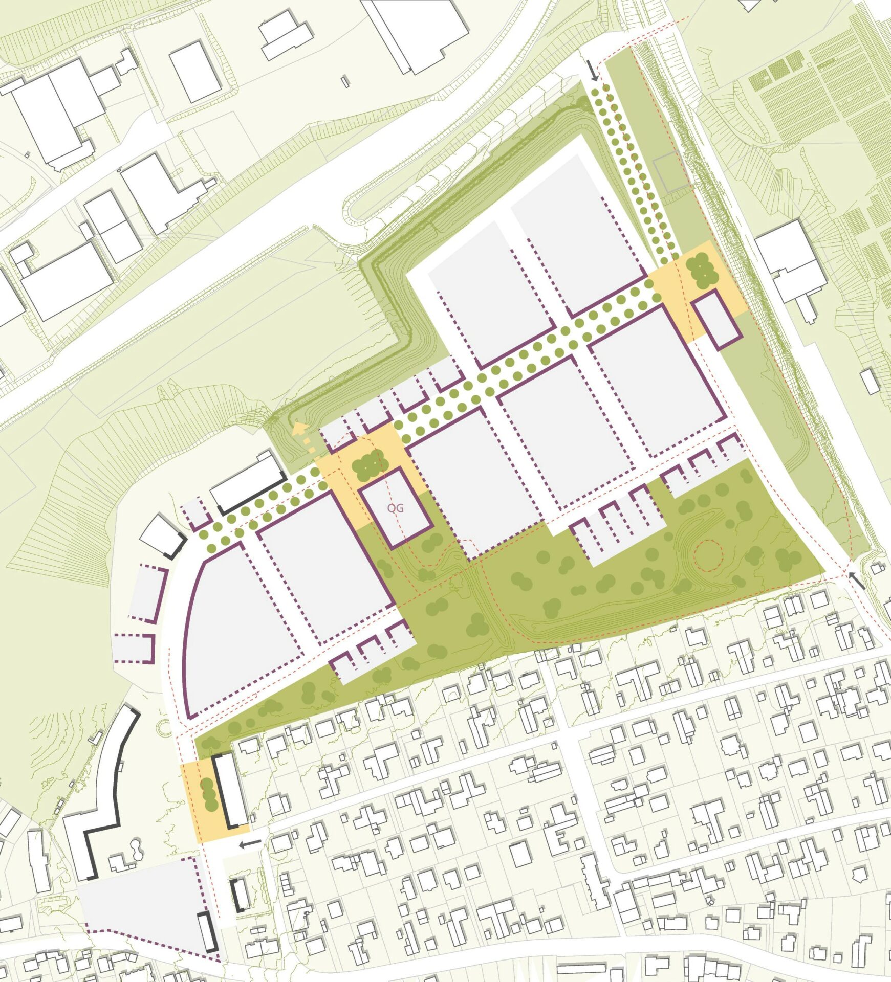 Leitidee des neues Quartiers ist der Grüne Saum, der das Quartier in eine grüne, multifunktional nutzbare grüne Hülle packt und als Bindeglied zu den Bestandsquartieren fungiert.