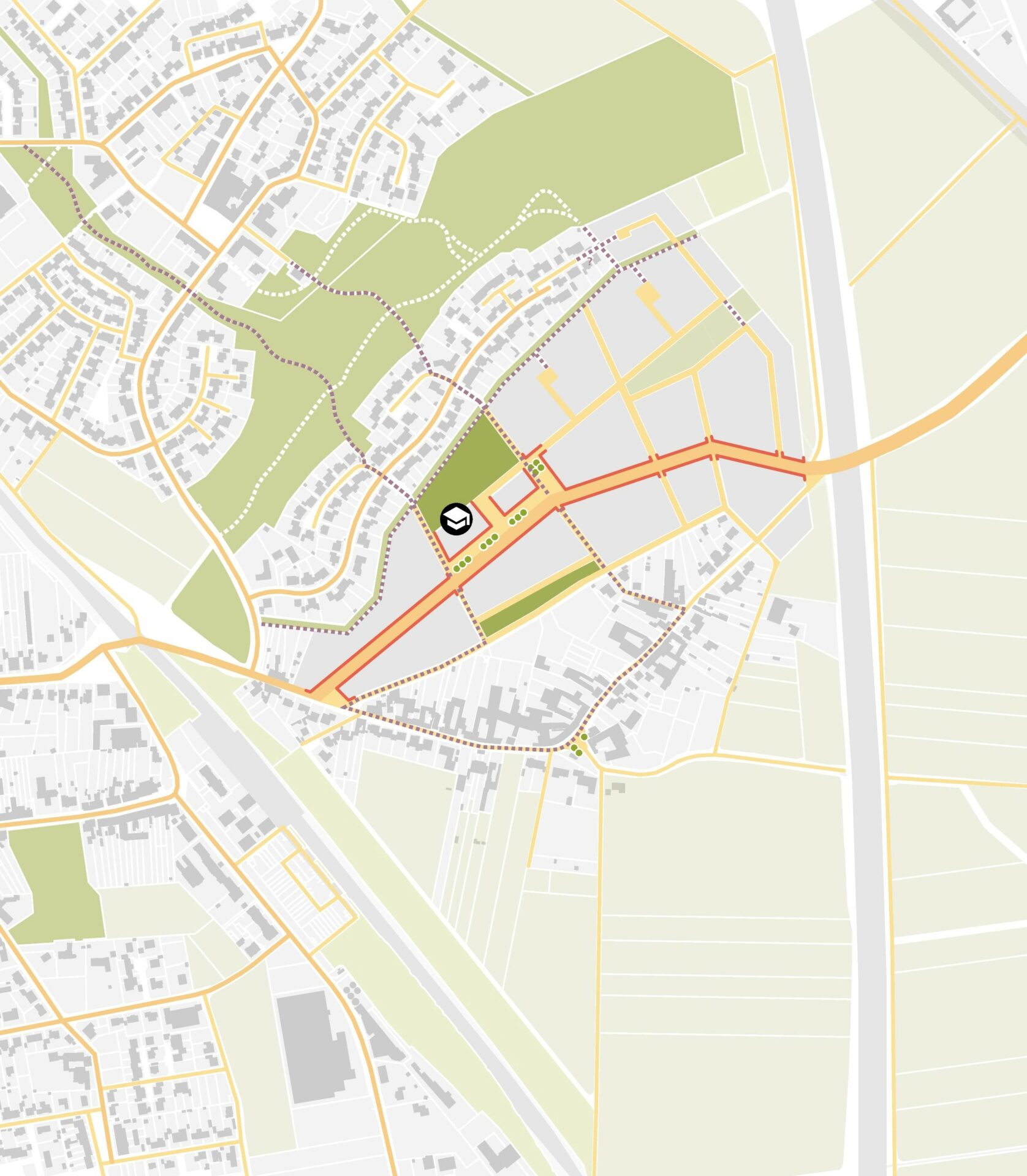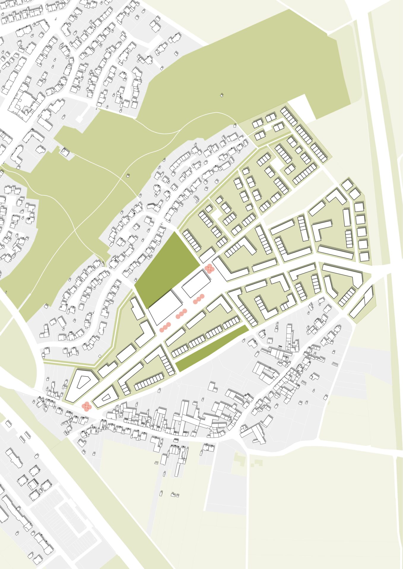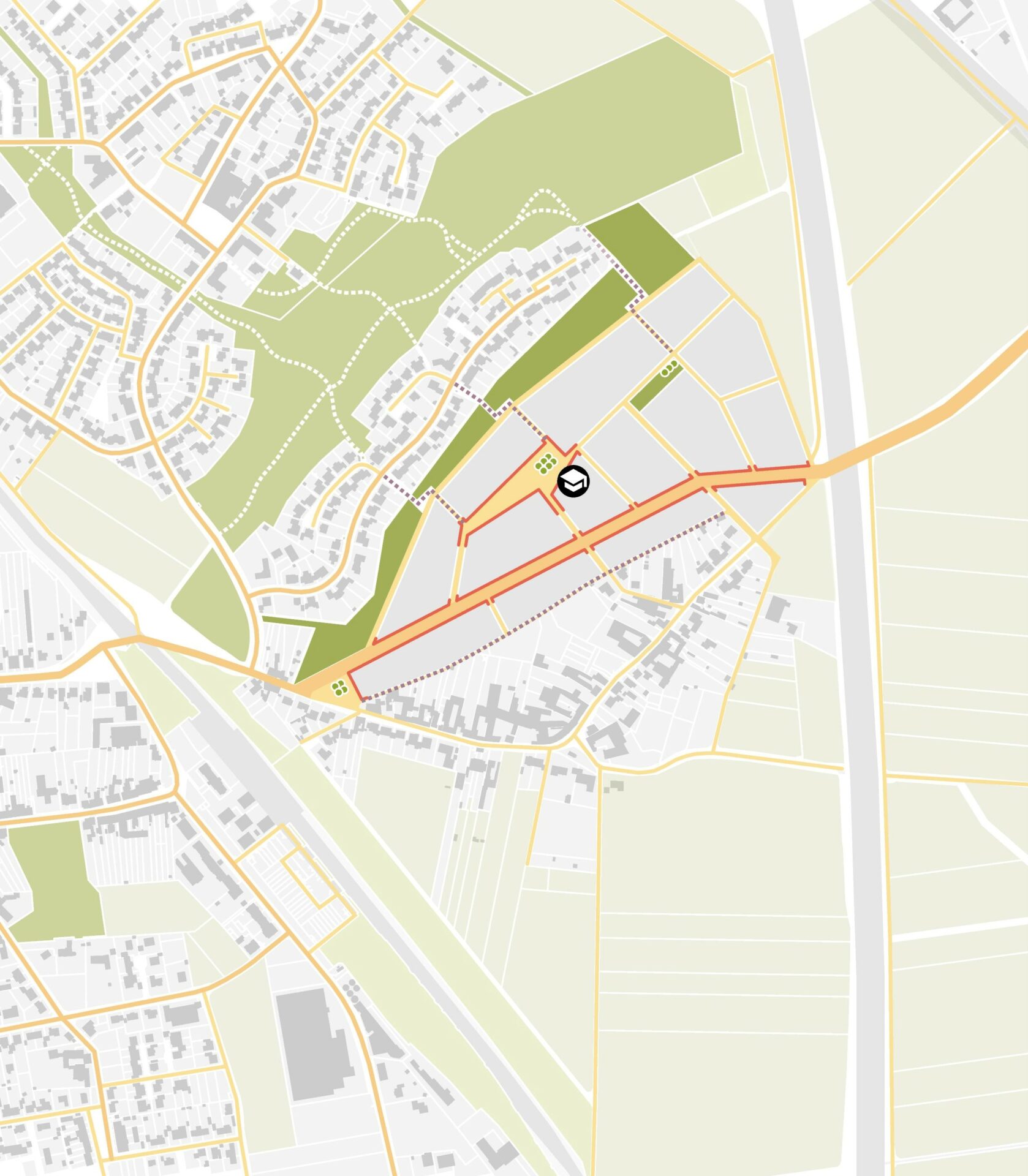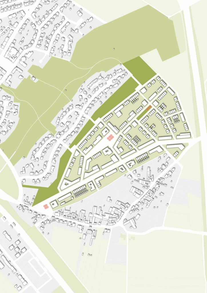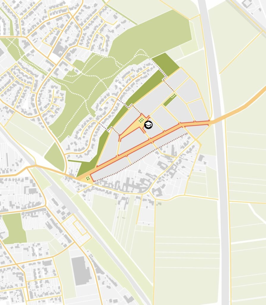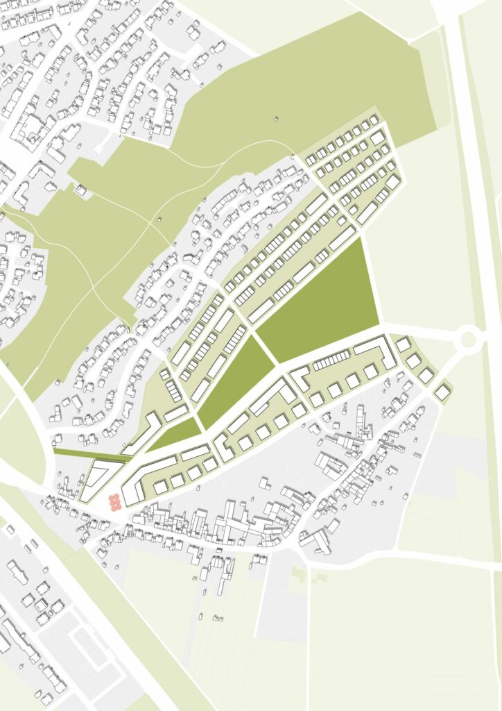 Vielfältige Mischung von Typologien und Wohnformen innerhalb der Baufelder in Anlehnung an organisch gewachsene Dorfstrukturen. Geschlossene Geschossbebauung entlang der verkehrsreichen Hauptstraße. Kleinteilige Geschoss-, Reihen- und Doppelhausstrukturen entlang der untergeordneten Straßen, gemischt mit Sonderformen in Anlehnung an dörfliche Hofstrukturen. Verortung einer Kita, ggf. einer Schule sowie weiterer soz./gew. Nutzungen.