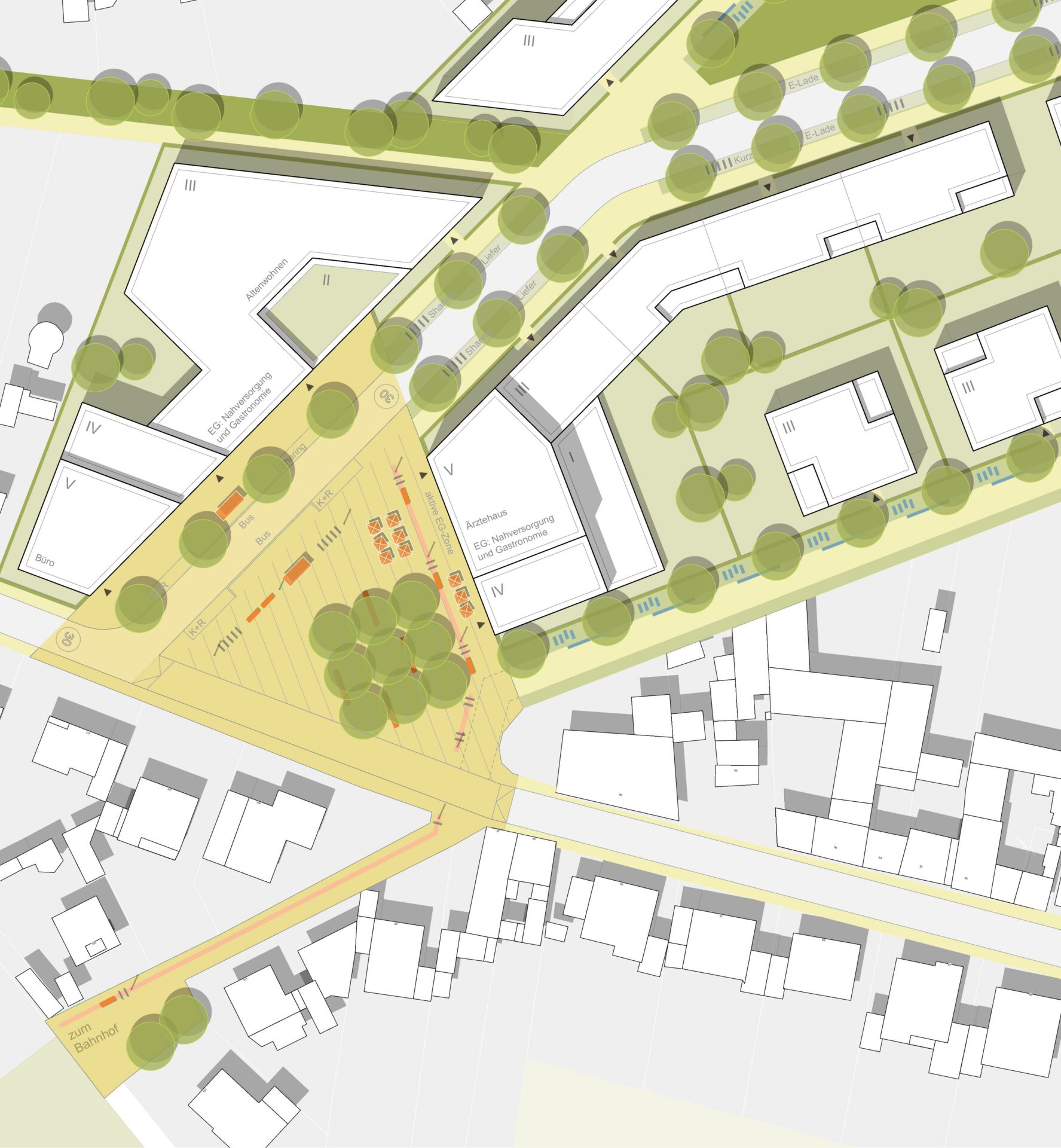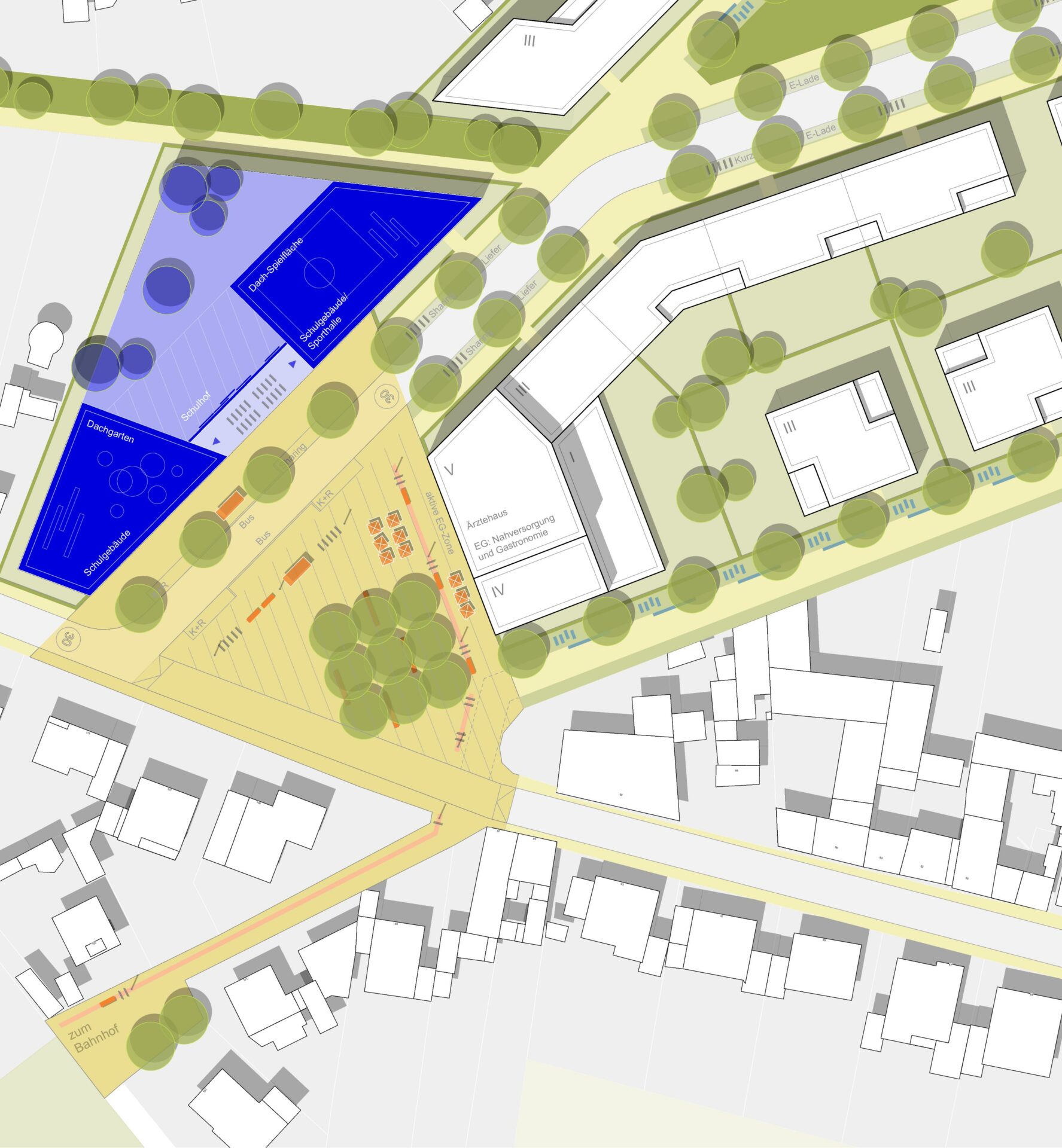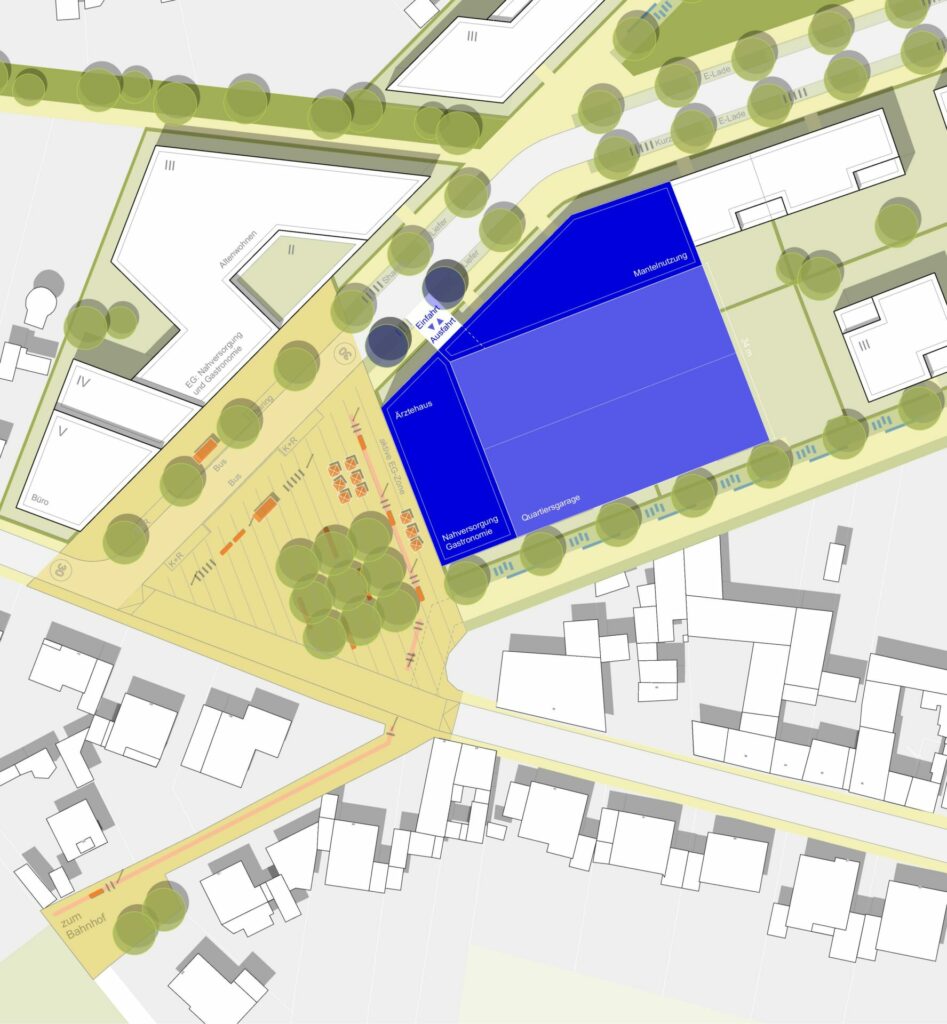 Zentraler Dorfplatz im Quartier sowie weiterer, untergeordneter Platz mit grünem Charakter als nachbarschaftliche Treffpunkte. Lebendiger Quartiersplatz mit gleichzeitiger Vorplatz-Funktion zum neuen Zugang zum Bahnhaltepunkt. Aktive Erdgeschosszonen mit Nutzungen der Nahversorgung (kleiner Supermarkt, Drogeriemarkt, Apotheke, Bäckerei o. Ä.) und Gastronomie. Bespielung des Platzes durch Außenbereiche der Gastronomie, gleichzeitig auch Sitz- und Aufenthaltsmöglichkeiten ohne Konsumzwang.