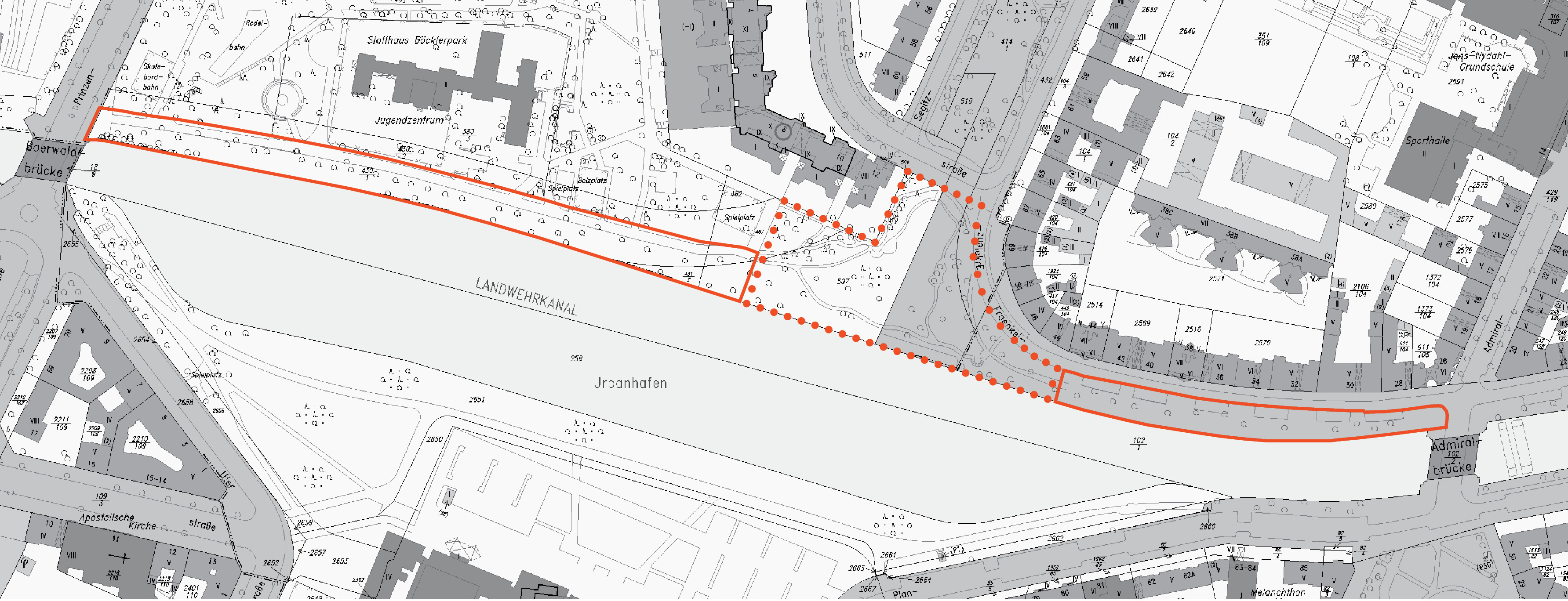 Im Rahmen unserer Tätigkeit als Programmkoordinatoren für den Städtebaulichen Denkmalschutz im Fördergebiet Urbanstraße führen wir für den Bezirk Friedrichshain-Kreuzberg ein Entwurfsverfahren für die Neugestaltung des Nordufers am Landwehrkanal zwischen Baerwald- und Admiralbrücke durch. Das Verfahren wird als nichtoffenes und nicht anonymes Verfahren mit fünf Landschaftsarchitekturbüros, die zuvor in einem Bewerbungsverfahren ausgewählt wurden, durchgeführt.