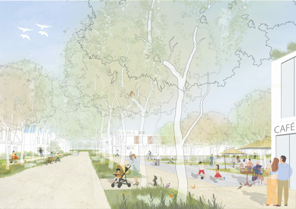 Die erhaltenswerten Bestandsbäume verbleiben weitgehend am heutigen Standort. Durch eine große Anzahl an klimaresilienten Neupflanzungen erhält das Quartier eine besondere Atmosphäre, die Biodiversität wird erhöht und der sommerliche Hitzestress gemindert. Neue Versiegelung wird durch kompakte Baukörper und optimierte Erschließungswege soweit wie möglich vermieden, Ausgleichsmaßnahmen können unmittelbar im vorgelagerten Grünsaum und offenen Landschaftsraum erfolgen. Durch das auf nachhaltige Mobilität ausgerichtete Erschließungskonzept wird zudem ein Beitrag zur Verkehrswende geleistet.