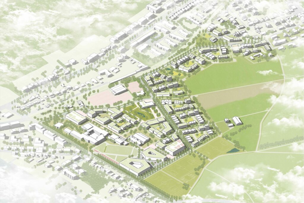 Entlang des historischen Pfaffenmühlenwegs spannt sich Richtung Osten ein klar gefasstes und von öffentlichen Räumen durchzogenes Stadtquartier auf, das sich aus unterschiedlichen Bausteinen zusammensetzt. Verbindendes Element der Teilbereiche ist die Campusachse. Sie wird im Süden vom Theodor-Fliedner-Gymnasium und im Norden von den Clustern des Mehrgenerationenquartiers mit seinen aktiven Erdgeschossnutzungen gesäumt. Im Osten passiert sie den Schulhof der neuen Gesamtschule und endet im Sportpark, von wo Übergänge in die offene Landschaft bestehen.