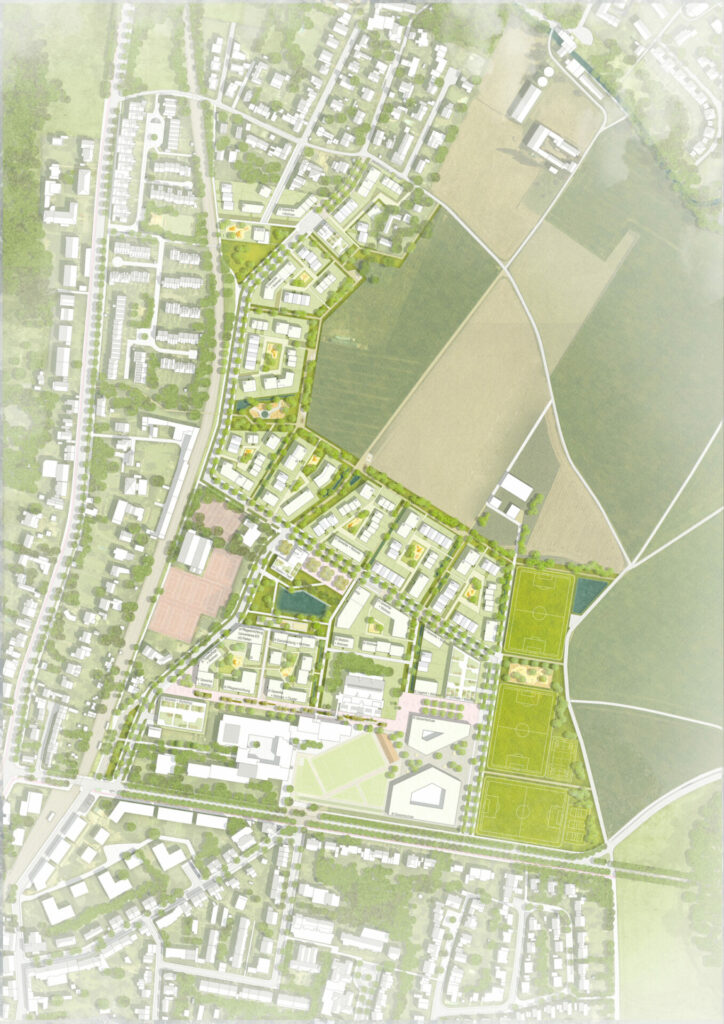 Auf den Baufeldern bilden die Nachbarschaftsanger gemeinschaftliche Höfe und Treffpunkte. Die grünen Fugen zwischen den Baufeldern verbinden die Quartierspromenade mit der Landschaft und bieten zusätzliche Retentionsräume. Am Pfaffenmühlenweg entsteht ein jugendlicher Spielort neben der Kita. Der Reiterhof wird als besondere Einheit dem Stadtteil vorgelagert im Landschaftsraum verortet, die Weideflächen liegen direkt daran angrenzend.