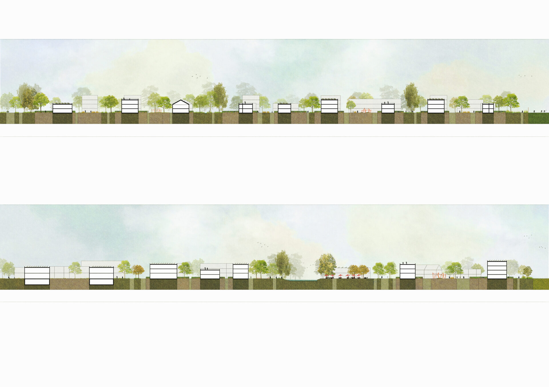 Die nördlich der Quartierspromenade angeordneten Baufelder sind zum einen zu dieser hin ausgerichtet, werden aber weitgehend von Innen über Nachbarschaftsanger erschlossen, die als kleinmaßstäbliche Ebene des nachbarschaftlichen Zusammenlebens eine wichtige Funktion im Quartiersgefüge übernehmen. Die Gärten der meist mit Wohnungen belegten Gebäude orientieren sich zu öffentlichen Dungwegen und dem landschaftlichen Saum und erzeugen ein vielfältiges Bild eines offenen Quartiers. Es wird ein Mix sehr unterschiedlicher Typologien vorgesehen mit dem Reihenhaus als kleinster Einheit, gefolgt von Mehrgenerationenhäusern in unterschiedlichen Konfigurationen und Geschosswohnungsbauten. In allen Typen wird der geforderte Anteil an sozialem Wohnraum abgedeckt. Eine höchstmögliche Mischung von Bauherrenschaften und Bewohnenden ist das Ziel.