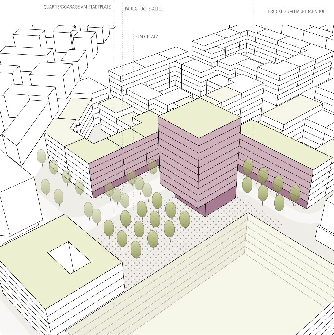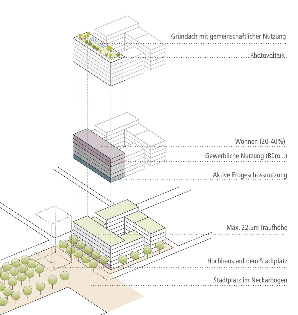 Eine ablesbare, eigenständige Gestaltung des Außenraums prägt ein Bild, welches Identität innerhalb des Neckarbogens schafft. Architektur und Freiraum greifen als eine Einheit ineinander. Durch das städtebauliche Leitbild mit der spezifischen Freiraumgestaltung für die öffentlichen Bereiche werden die einzelnen Baufelder des Quartiers zu einem einheitlichen, schlüssigen Gesamtbild verbunden.