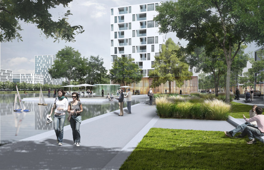 Die heutige Situation im Entwurfsgebiet wird bestimmt durch ein Nebeneinander unterschiedlicher und kaum zusammenhängender Einzelräume. Die City Ost als Ort besteht dabei noch am ehesten im Bereich des Bahnhofszugangs. Der Entwurf zeigt sich gegenüber der unterschiedlichen Lagen integrierend und entwickelt die Ausbildung von Teilräumen entlang des gemeinsamen Leitelements der zentralen Park- und Wasserlandschaft zum übergreifenden Thema weiter. Im Hinblick auf die Freiraumqualität aber auch die enorme Bildkraft des „Gladsees“ wurde dieses zentrale Gewässer als Leitmotiv der Vertiefung weiterverfolgt. In Verbindung mit der Aufbereitung des Regenwassers -ggf. unter Einbeziehung des Gewässersystems des Gladbachs- stellt er ein nachhaltiges Statement zu einer nachhaltigen und qualitätvollen Entwicklung der innerstädtischen Ressourcen dar.
