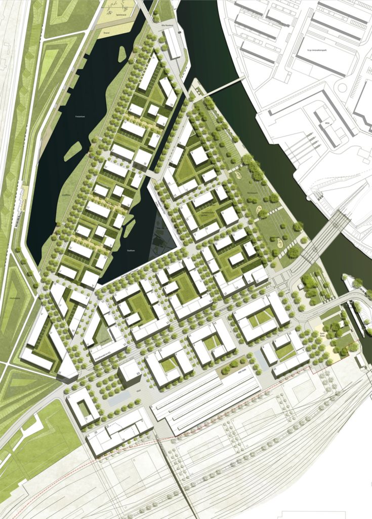 Mit der Buga 2019 gewinnt Heilbronn auch die Chance, seine fragmentierte Flusslandschaft in einem neuen Zusammenhang zu interpretieren. Der Masterplan umfasst den Entwicklungsraum der Buga mit den angrenzenden Quartieren. Vier „fließende“ landschaftliche Bänder umflechten die Ufer von Neckar und Neckarkanal. Sie stärken das Kontinuum des Flussraums und helfen die Zäsuren zu überwinden.