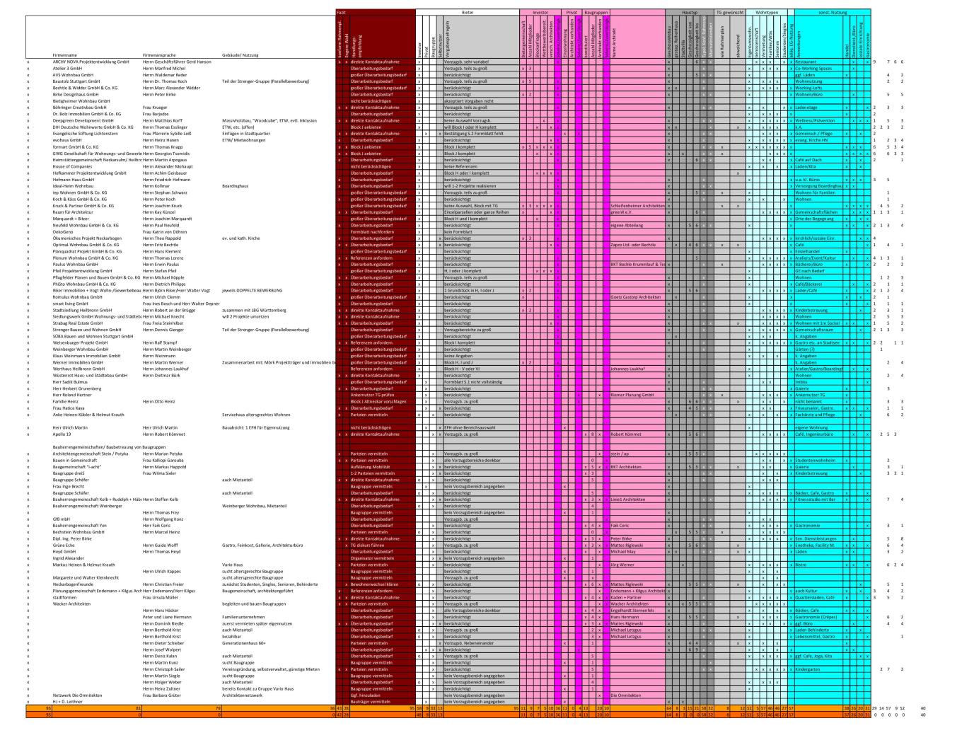 Gegenstand der Bearbeitung unseres Büros war die Sichtung und Auswertung der im Rahmen des Verfahrens bei der Stadt eingegangenen Bewerbuungsbägen. Hierbei ging es neben der Beantwortung wesentlicher Fragestellungen aus Sicht der Rahmenplanung und der späteren Projektentwicklung auch um die Erstellung eines leistungsfähigen, digitalen Datensatzes, welcher auch nach Abschluss als schnelles Abfragewerkzeug seitens des Auftraggebers genutzt werden kann.