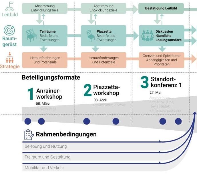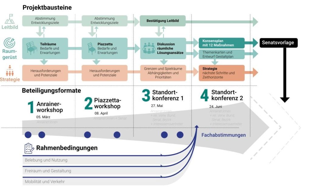 Der Planungsprozess zeichnete sich durch eine intensive und kontinuierliche Beteiligung aller relevanten Akteure aus. Ziel war es innerhalb kürzester Zeit einen tragfähigen Konsens zwischen über 60 Akteuren verschiedener Institutionen zu erzielen – darunter Stiftung Preußischer Kulturbesitz, weitere Kultur-Anrainer:innen, verschiedene Senatsverwaltung des Landes Berlin, Bezirk Mitte sowie weitere Interessensvertreter:innen. Dazu fanden verschiedene Beteiligungs- und Steuerungsformate statt: