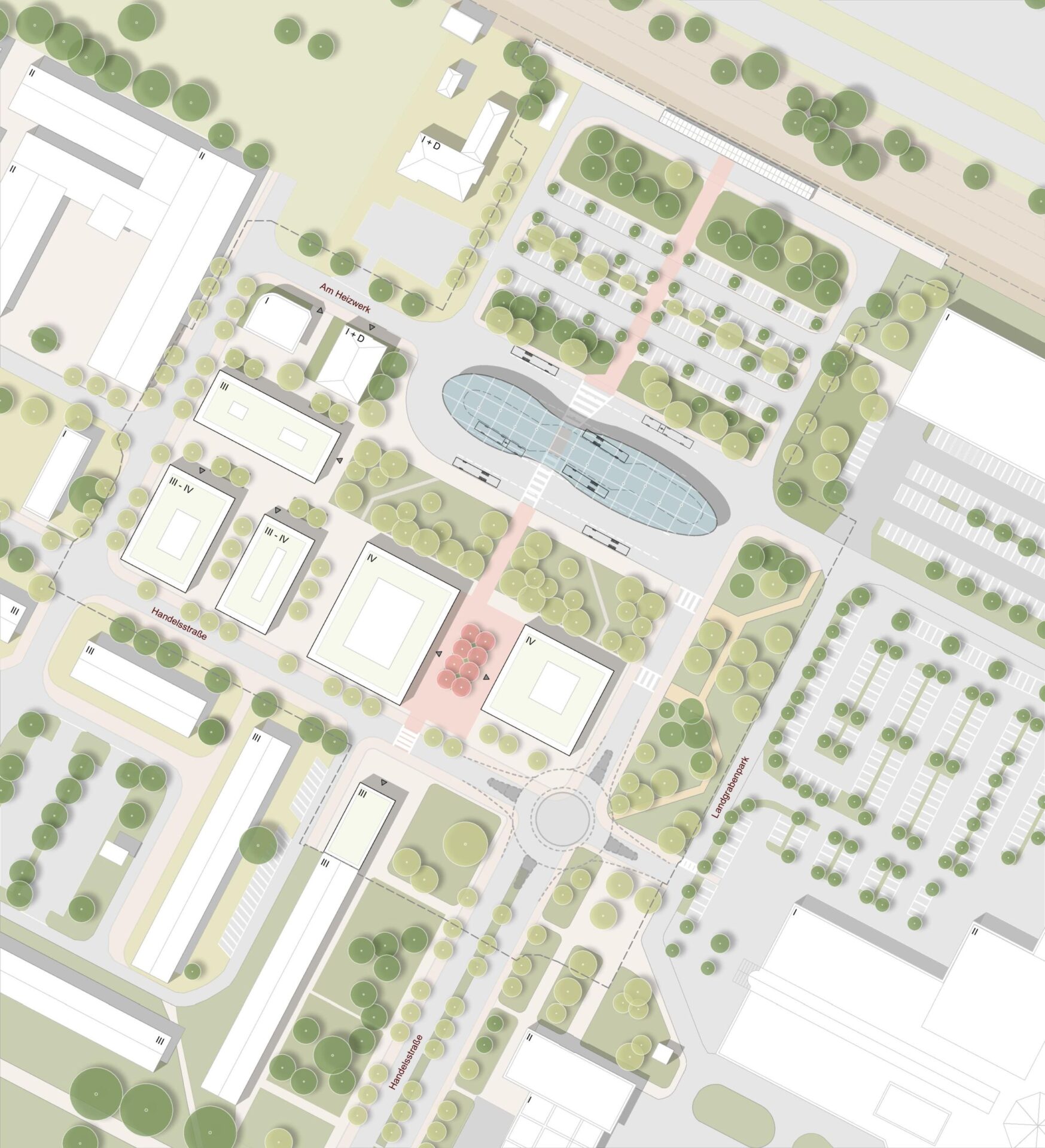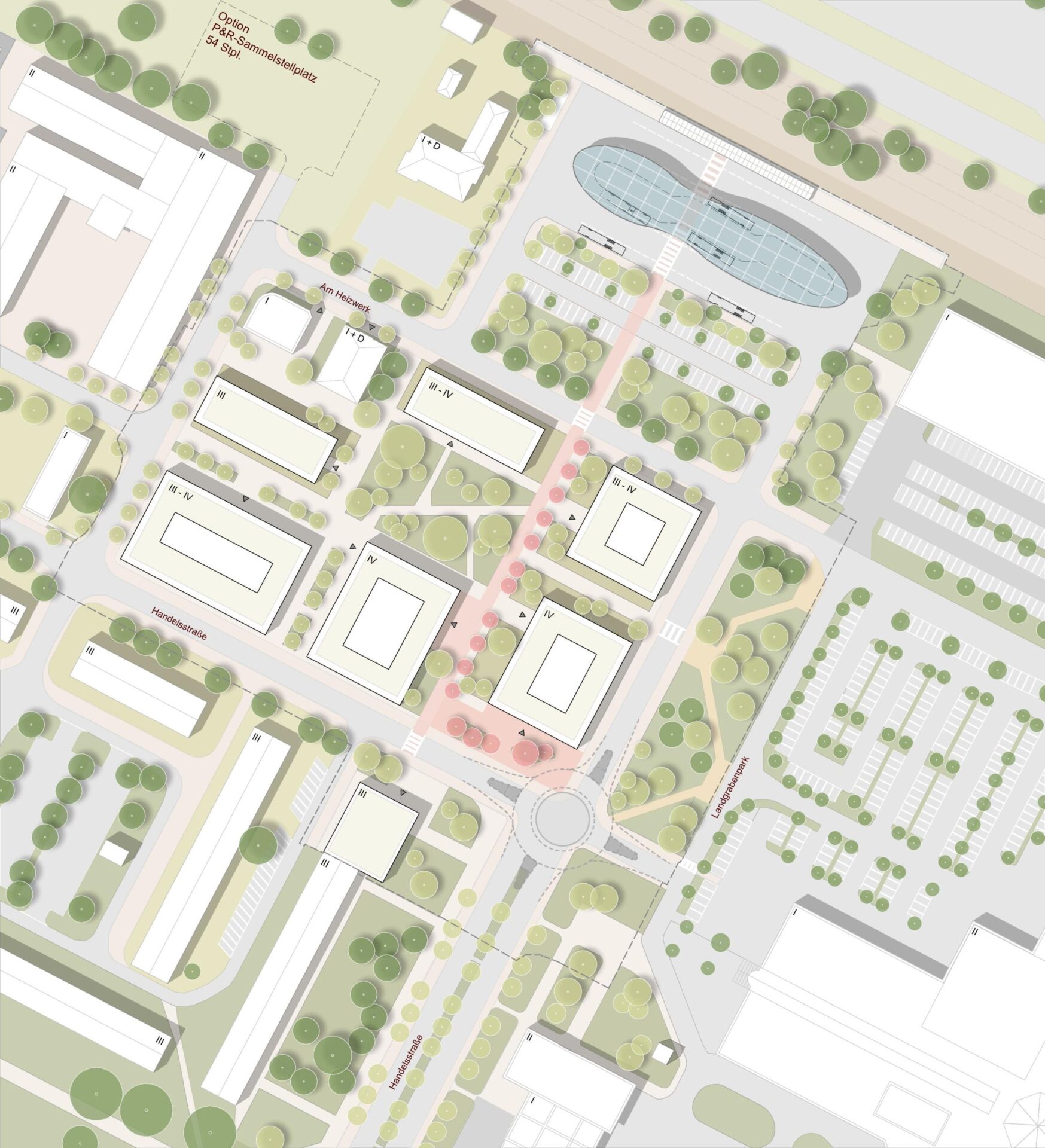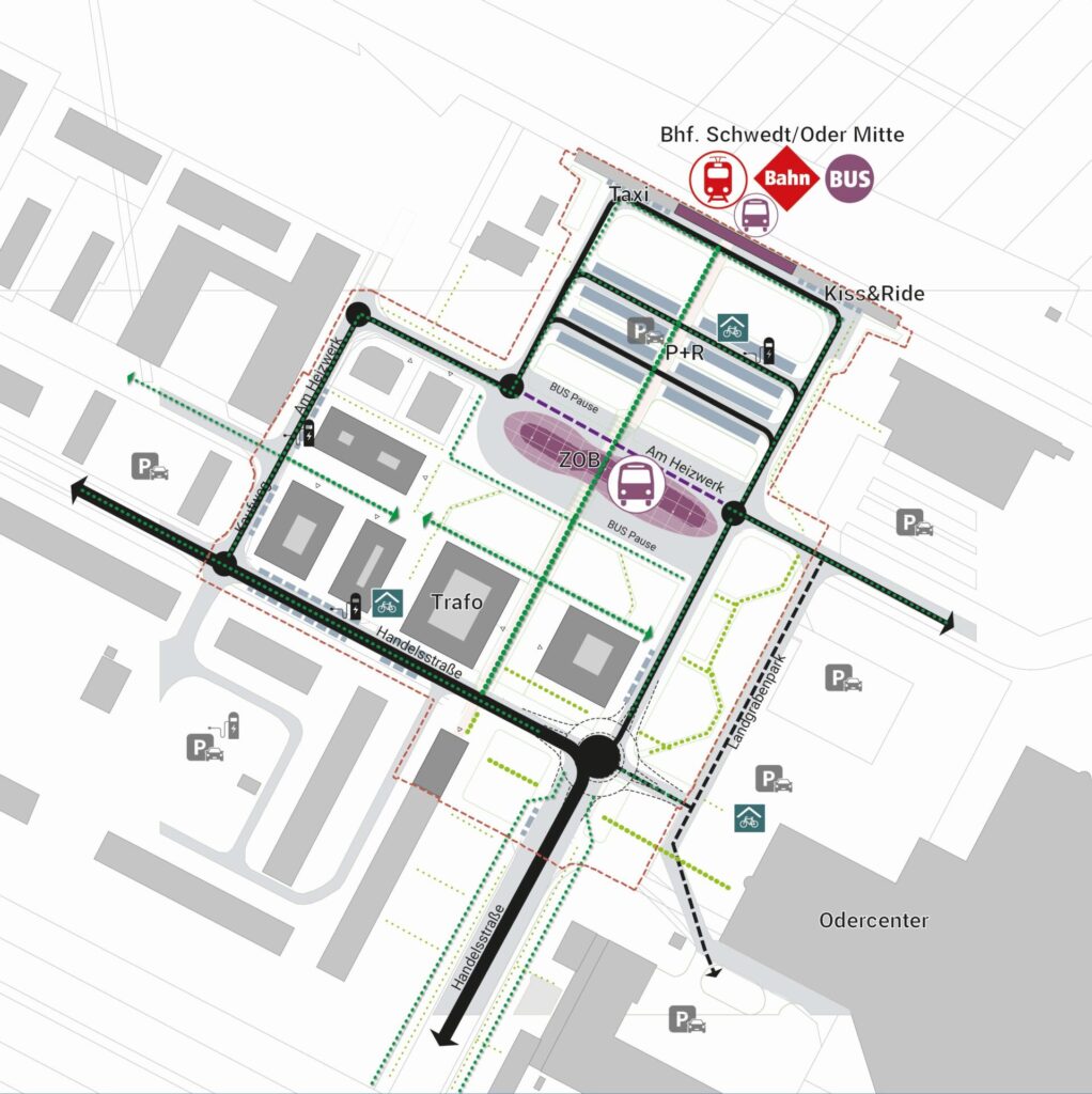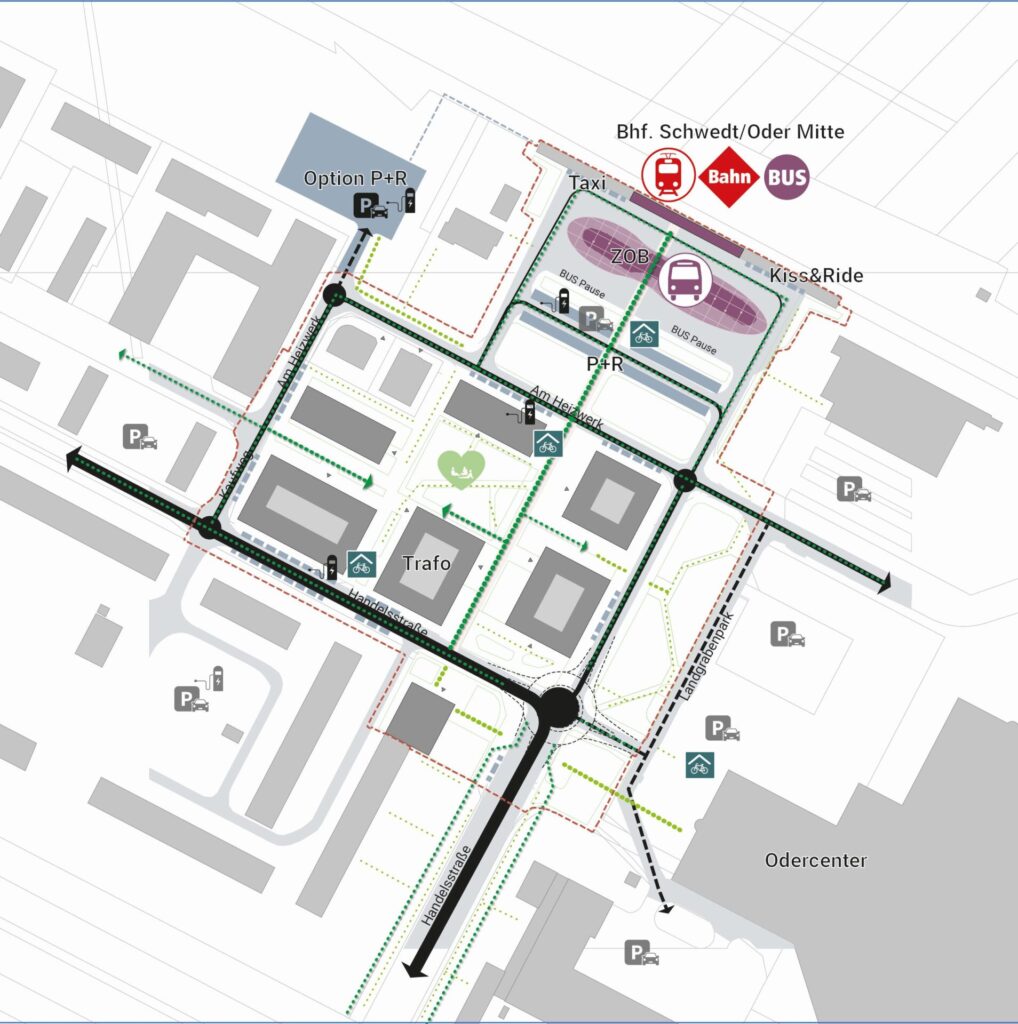 Ergebnis dieser Machbarkeitsstudie sind zwei städtebauliche Varianten, die unterschiedliche Stärken und Qualitäten aufweisen. In beiden Varianten wurde die verkehrlich schwierige Situation an der Handelsstraße gelöst, um dem entstehenden Campus eine klare Eingangssituation zu schaffen. Der ZOB wurde neugeordnet und so die Abhängigkeiten der unterschiedlichen Verkehrsteilnehmer*innen aufeinander abgestimmt und optimiert.