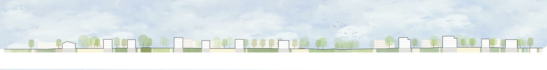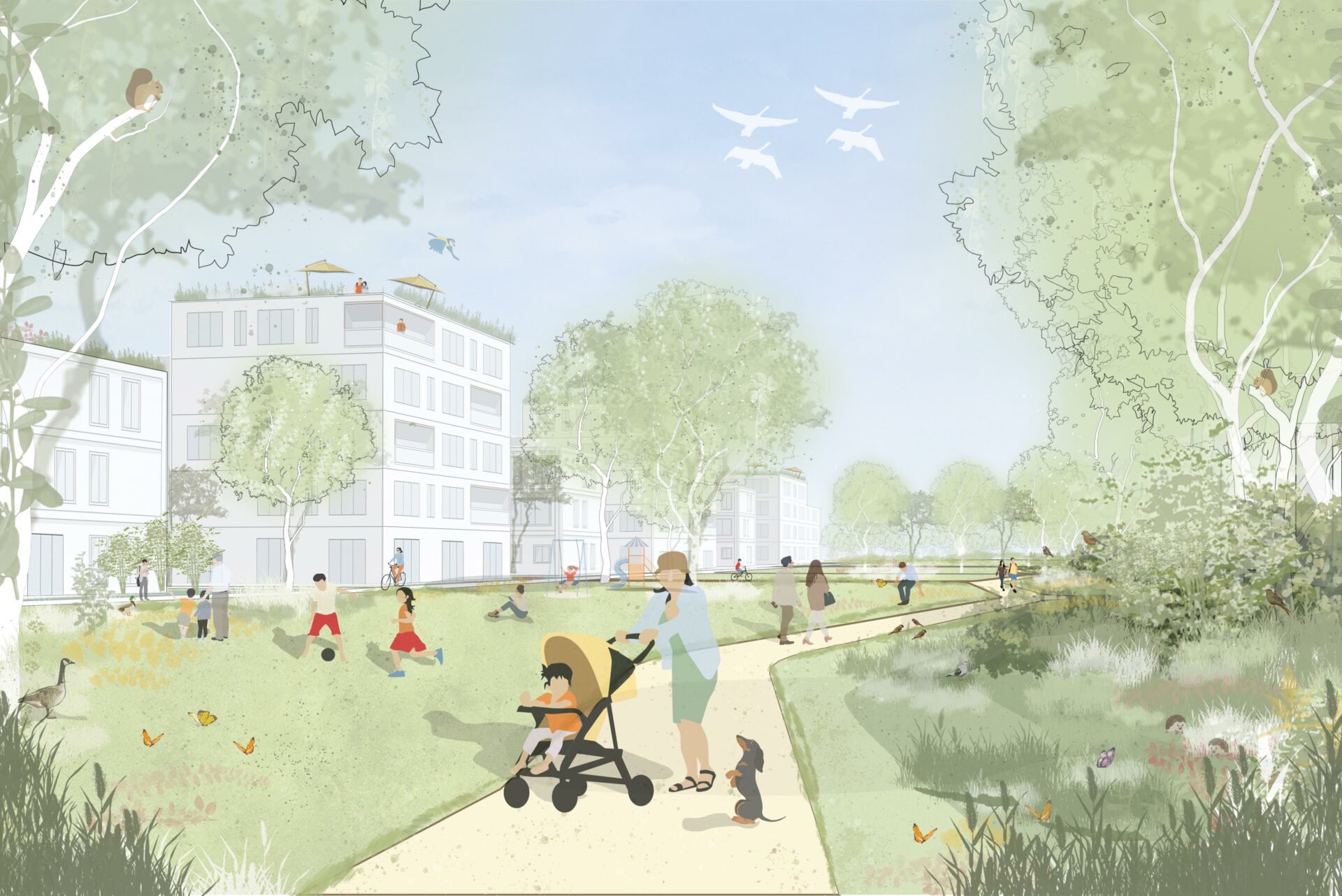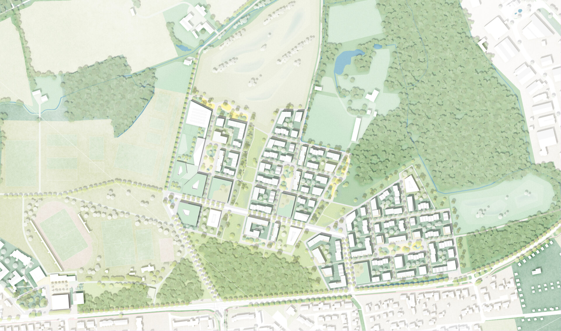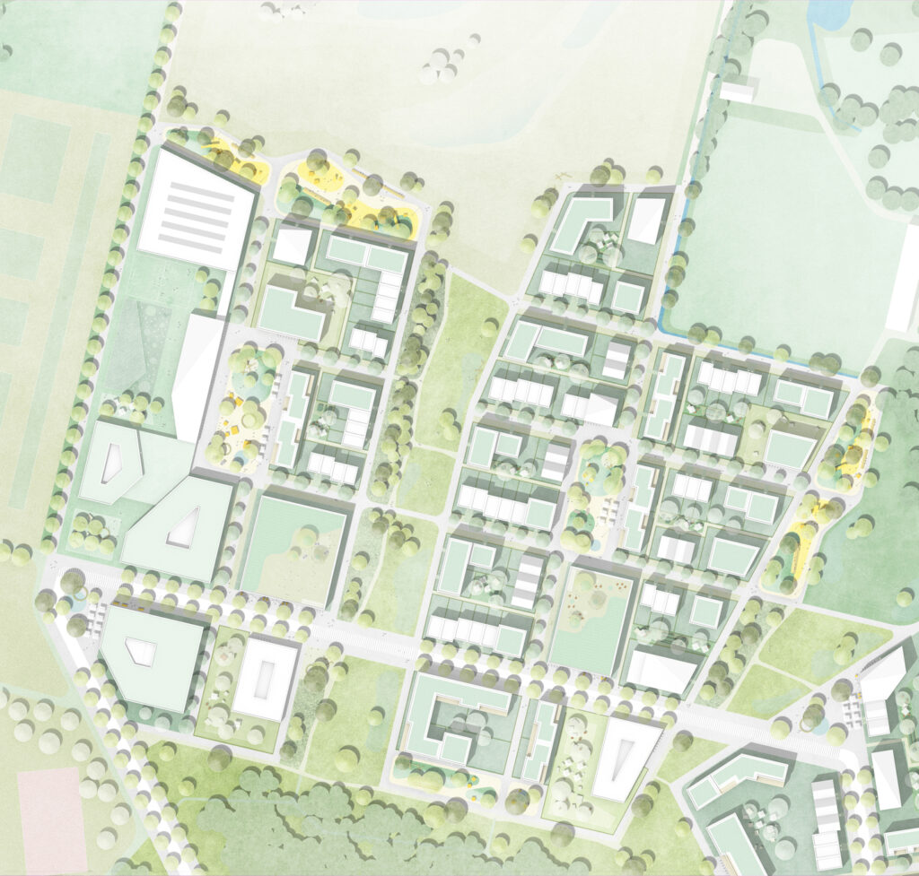 Innerhalb jedes Baufelds wird eine Mischung unterschiedlicher Typologien und Wohnformen etabliert, die einerseits auf die verschiedenen Lagen zwischen Waldrand und Wiesenlandschaft reagieren und zugleich über wiederkehrende Elemente Quartierszusammenhänge und Nachbarschaften ablesbar machen. Neben Geschosswohnungsbauten als Mehrfamilienhäuser für unterschiedliche Zielgruppen (geförderter Wohnungsbau, preisgedämpfter Wohnraum, frei finanzierte Miet- und Eigentumswohnungen) werden die geforderten Einfamilienhäuser in drei unterschiedlichen Typen horizontal gegliederter Doppel- und Reihenhäuser verortet, die den Wunsch nach einem eigenen Haus mit einer zeitgemäßen und nachhaltigen Flächennutzung in Einklang bringen. Die halböffentlichen Gartenseiten der Baufelder werden durch kleine Fußwege für alle Anwohnenden nutzbar und die als gemeinschaftlich auszuformulierenden Grundstücksanteile der Mehrfamilienhäuser bieten Rückzugs- und Treffpunkte im nachbarschaftlichen Rahmen. Die Sonderwohnformen werden grundsätzlich dezentral im Gebiet angeboten, die eher gruppierten Nutzungsbausteine (Seniorenwohnen, WGs) entlang der Quartierspromenade.