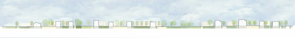 Durch die Kombination von Typologien und Wohnformen entsteht zudem ein lebendiges und dennoch strukturiertes Kubaturbild, dass durch Geschossigkeiten von drei bis vier, punktuell maximal fünf Vollgeschossen mit unterschiedlichen Dachformen die Gegebenheiten vor Ort im Sinne urban gemischter Nachbarschaften weiterentwickelt. Entlang der Kaltluftzugbereiche bleiben die Geschosszahlen etwas niedriger, um negative Auswirkungen zu vermeiden.