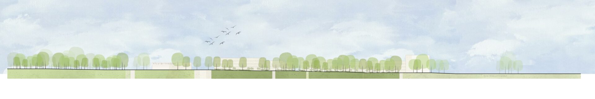 Der Grünzug an der Wallhecke nimmt die bestehenden Gehölzstrukturen der schützenswerten Wallhecke in sich auf und verknüpft das Quartier übergeordnet mit den Ausgleichsflächen an den Weiten Wiesen am Erdelbach. Als selbstverständlicher Bestandteil des Grünzugs ist die Wallhecke prägend für die Atmosphäre und definiert die westliche Raumkante zur angrenzenden Bebauung. Zusätzlich wird sie durch eine standorttypische Unterpflanzung ökologisch aufgewertet und als markantes Freiraumelement herausgearbeitet. Die weiteren Grünflächen werden als nutzungsoffene und extensive Wiesenflächen ausgebildet. Sie bieten den AnwohnerInnen und BesucherInnen des Quartiers ausreichend Raum für sportliche Aktivitäten, zum Lesen oder zum Pick-Nick im Freien. Der Grünzug am Kaiserbusch verknüpft die anliegenden Waldstrukturen und erhält durch diese seinen Charakter. Die Qualitäten der Gehölzstrukturen werden auf den Grünzug übertragen und weiterentwickelt. Entlang der westlichen Raumkante werden neue Gehölzstrukturen und Pflanzungen als dichtes und raumprägendes Grün etabliert. Auch hier werden die weiteren Grünflächen als nutzungsoffene, sowie extensive Wiesenflächen ausgebildet, um AnwohnerInnen und BesucherInnen Raum zur Aneignung zu bietet.