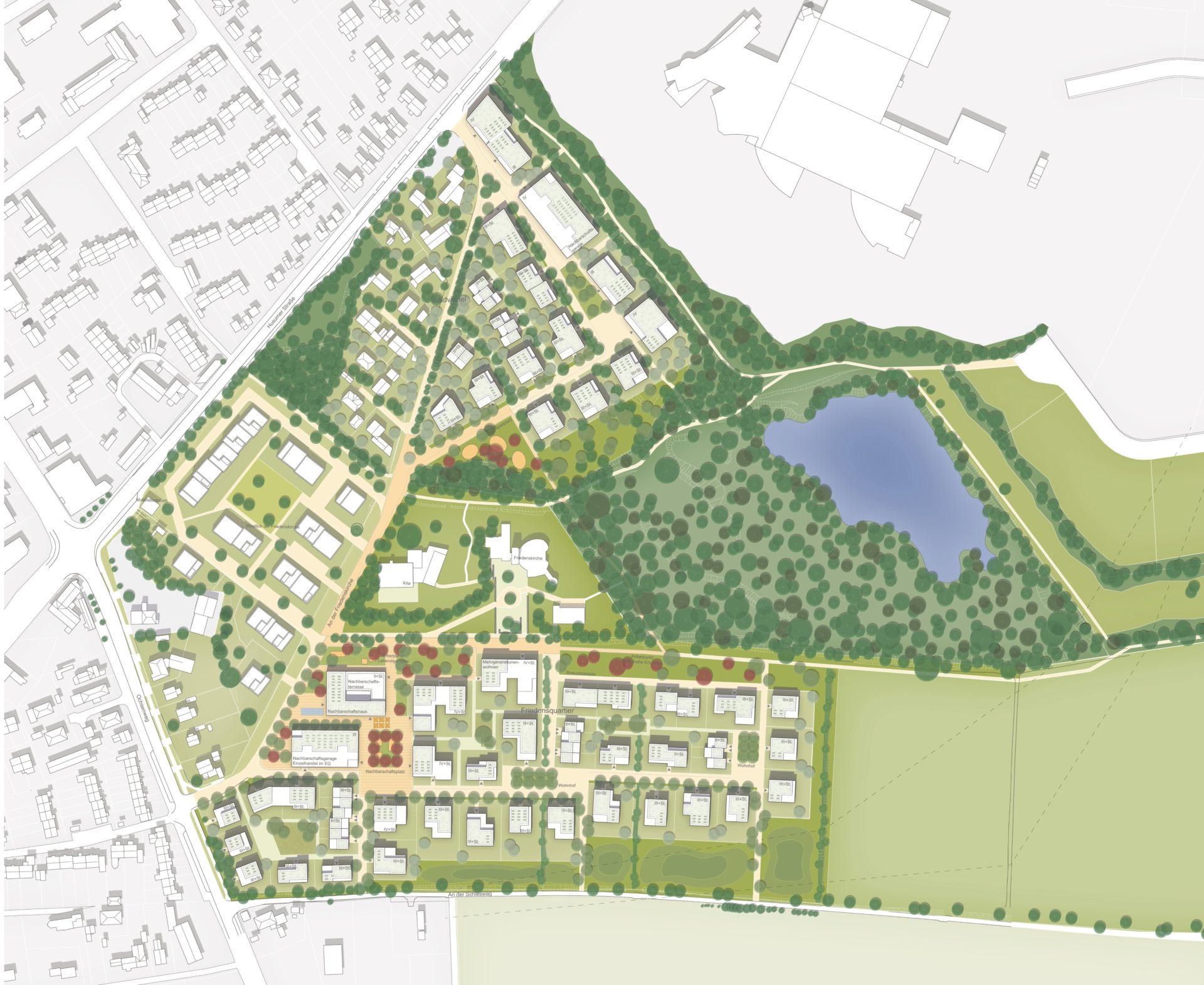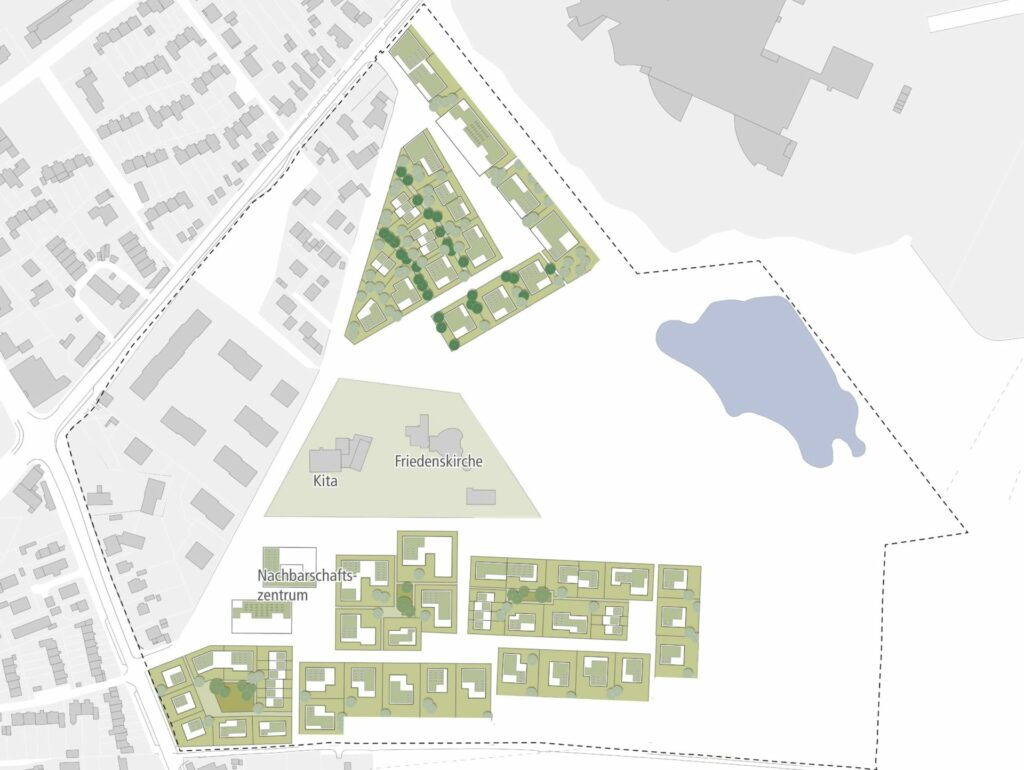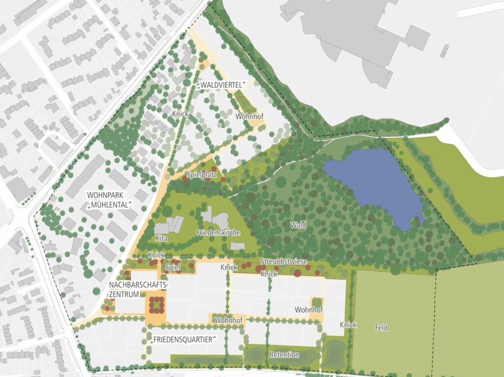 Der städtebauliche Dreiklang aus arrondiertem Waldviertel im Norden, geplanter Mühlentalsiedlung im Westen und neuem Friedensquartier im Süden rückt den bestehenden kirchlichen Standort mit Kita in den Mittelpunkt und ergänzt diesen durch belebende kommerzielle, kontemplative und soziale Nutzungen in neuen Gebäuden und Freiräumen zu einem integrierten Nachbarschaftszentrum.