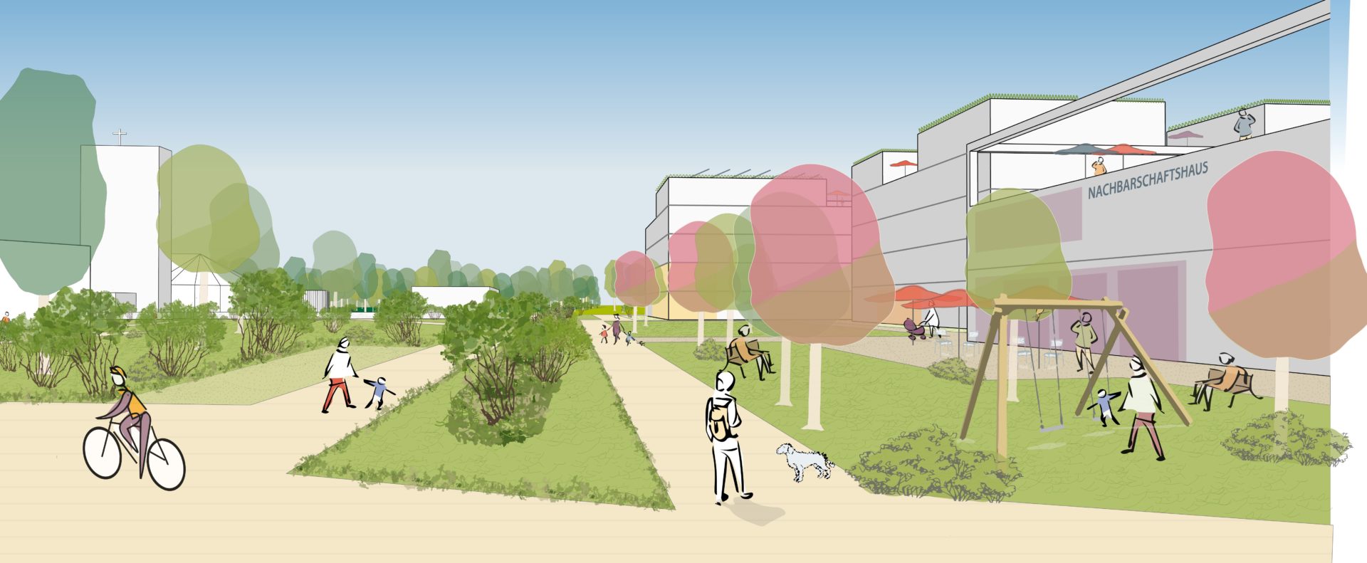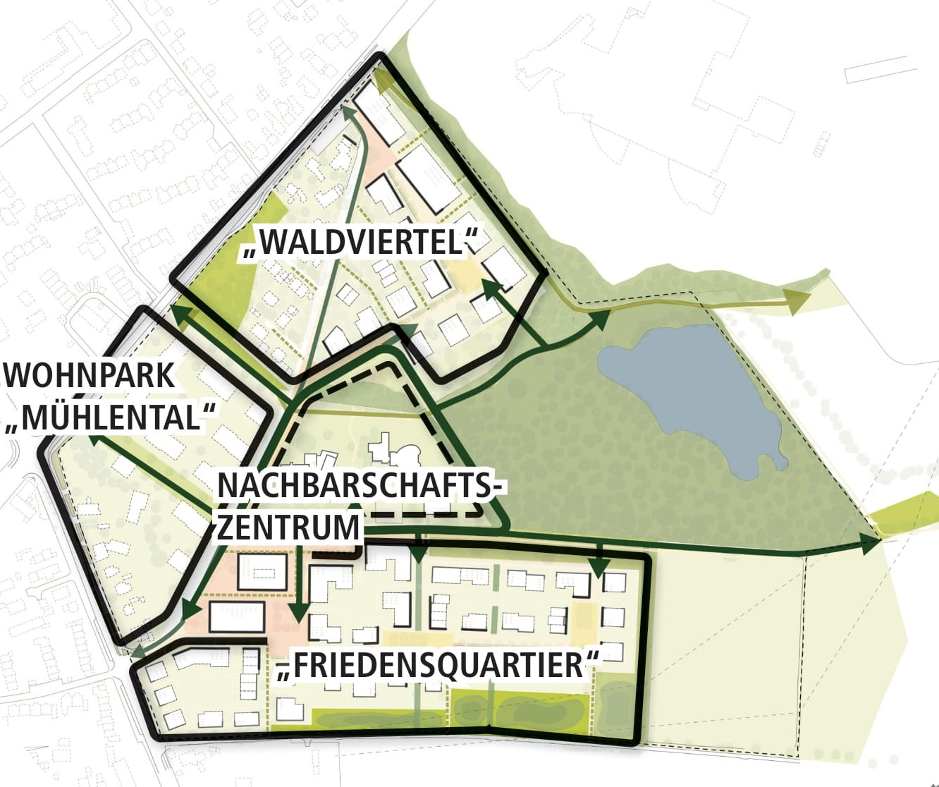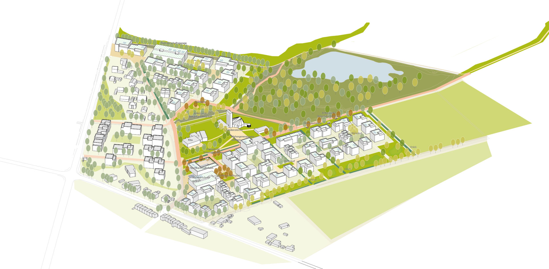 Der städtebauliche Dreiklang aus arrondiertem Waldviertel im Norden, geplanter Mühlentalsiedlung im Westen und neuem Friedensquartier im Süden rückt den bestehenden kirchlichen Standort mit Kita in den Mittelpunkt und ergänzt diesen durch belebende kommerzielle, kontemplative und soziale Nutzungen in neuen Gebäuden und Freiräumen zu einem integrierten Nachbarschaftszentrum.