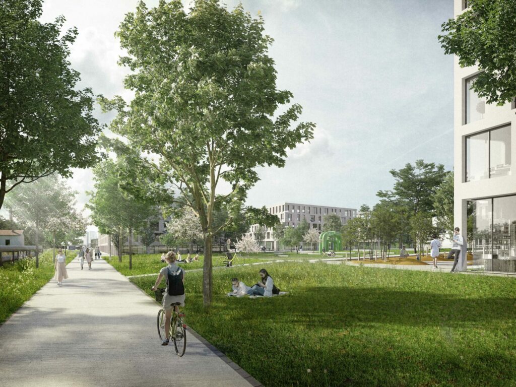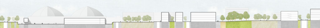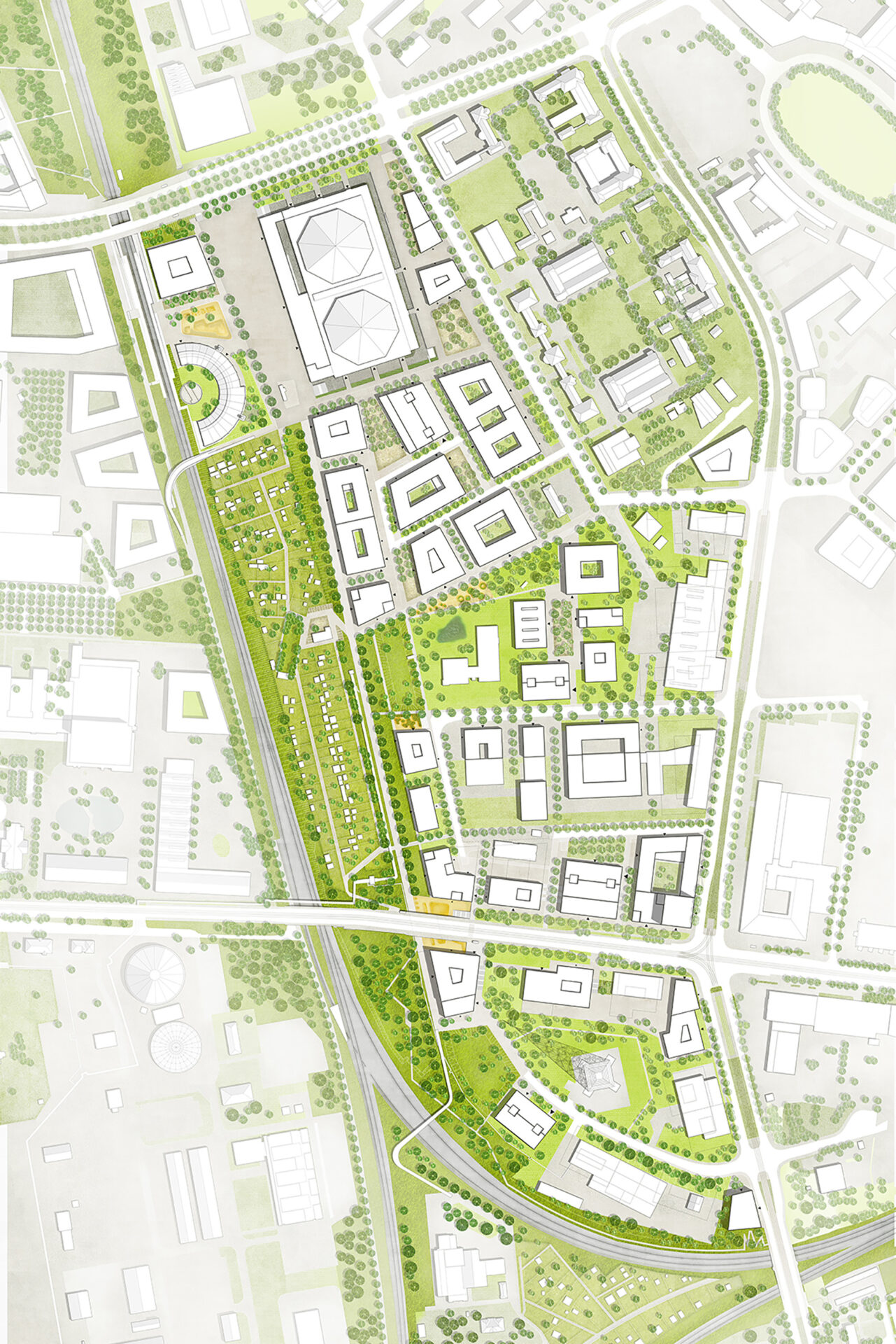 Die bestehenden Freiraumelemente entlang der Bahn werden qualifiziert sowie mit neuen Funktionen und Raumangeboten ergänzt. Dieses großzügige langgestreckte Parkband mit differenzierten Naherholungsangeboten für vielseitige Nutzergruppen verknüpft die Stadtschollen untereinander sowie mit den angrenzenden Stadt- und Freiräumen.