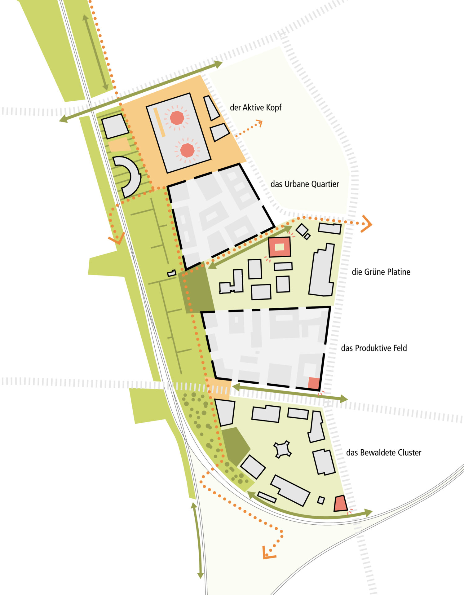 Von Nord nach Süd sind dies: der Aktive Kopf, das Urbane Quartier, die Grüne Platine, das Produktive Feld, das Bewaldete Cluster.