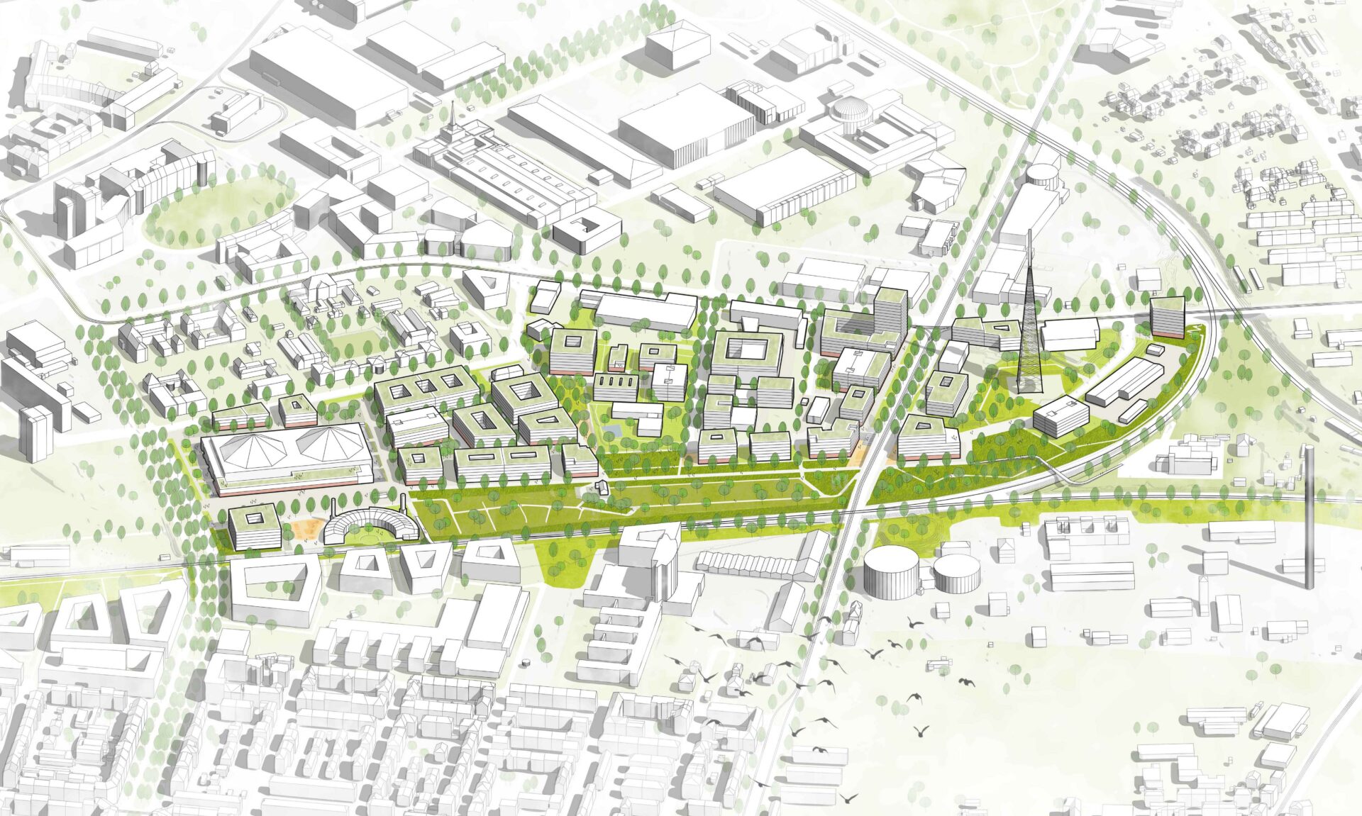 Die südlich angrenzende ‚Grüne Platine‘ nimmt die vorhandenen solitären Strukturen des Bestandes auf und qualifiziert diese weiter zu einem grüngeprägten Quartier mit offenen Typologien. Das hier angesiedelte Großforschungszentrum bildet mit seinen sieben Geschossen das prägende Gebäude des Quartiers, die restlichen Gebäude variieren zwischen drei und fünf Geschossen.