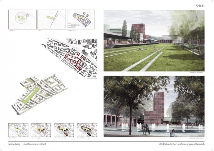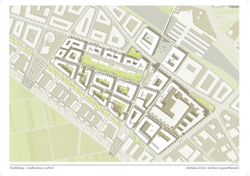 Das neue Quartier wird durch die übergeordnete Nord-Süd-Achse von der Universität Heidelberg über den Neckar, den Hauptbahnhof, die Bahnstadt bis zur Landschaft eingebunden. Innerhalb des Stadt-Campus wird die Güteramtstraße als Teil dieser Achse über eine Platzfolge (Bahnhofsplatz- Süd – Science-Tower – Landschaftsbalkon) aufgewertet. Das städtebaulich-räumliche Gelenk “Hauptbahnhof – Science-Tower – Zollhofgarten” verbindet den Bahnhofvorplatz mit dem zentralen Element des Stadt-Campus und leitet intuitiv in das Herz der Bahnstadt. Die Morphologie des neuen Quartiers bildet eine robuste städtebauliche Grundstruktur mit hoher Flexibilität. Sie gliedert sich in vier Zonen mit unterschiedlichen Baufeldgrößen. Nördlich im Übergang zur Stadt befinden sich kleine, kompakt bebaute Baufelder mit hoher Dichte. Südlich, im Übergang zum Wohnen an der Promenade und zur Landschaft, liegen bewährte, mit Blöcken bebaute Baufelder. Die Höfe der Blöcke am Langen Anger sind über Öffnungen im Blockrand zugänglich. Östlich, als Erweiterung des Technologieparks bieten große Baufelder ausreichend Platz für die Integration flächenintensiver Produktions- und Forschungseinrichtungen im Blockinneren. Die keilförmige, transitorische Zone zwischen Hauptbahnhof und Landschaftsraum ermöglicht innerhalb der urbanen, robusten Blockstruktur mit hoher Dichte die Integration unterschiedlicher Nutzungen