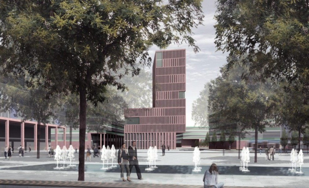 Mit dem Science Tower entsteht an der Czernystraße eine spannungsvolle Torsituation für das neue Quartier und das transitorische Band bis zum Landschaftsbalkon im Süden. Der südliche Bahnhofsplatz wird dabei keilförmig nach Süden in das Gebiet verlängert und damit mit dem Zollhofgarten verknüpft. Der Science Tower als Solitär verbindet und gliedert diese Platzräume. Er ist Raumschleuse und markantes Merkzeichen in einem. Der Bahnhofsplatz ist zum einen selbstverständlich Verkehrsplatz mit Raum für die Vorfahrt und die Anlieferung. Nach Norden hin wird er in Überbauung der Verkehrsflächen darunter zum Stadtbalkon mit Blick über die Gleisschneise. Ein Baumraster greift das