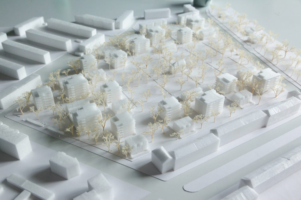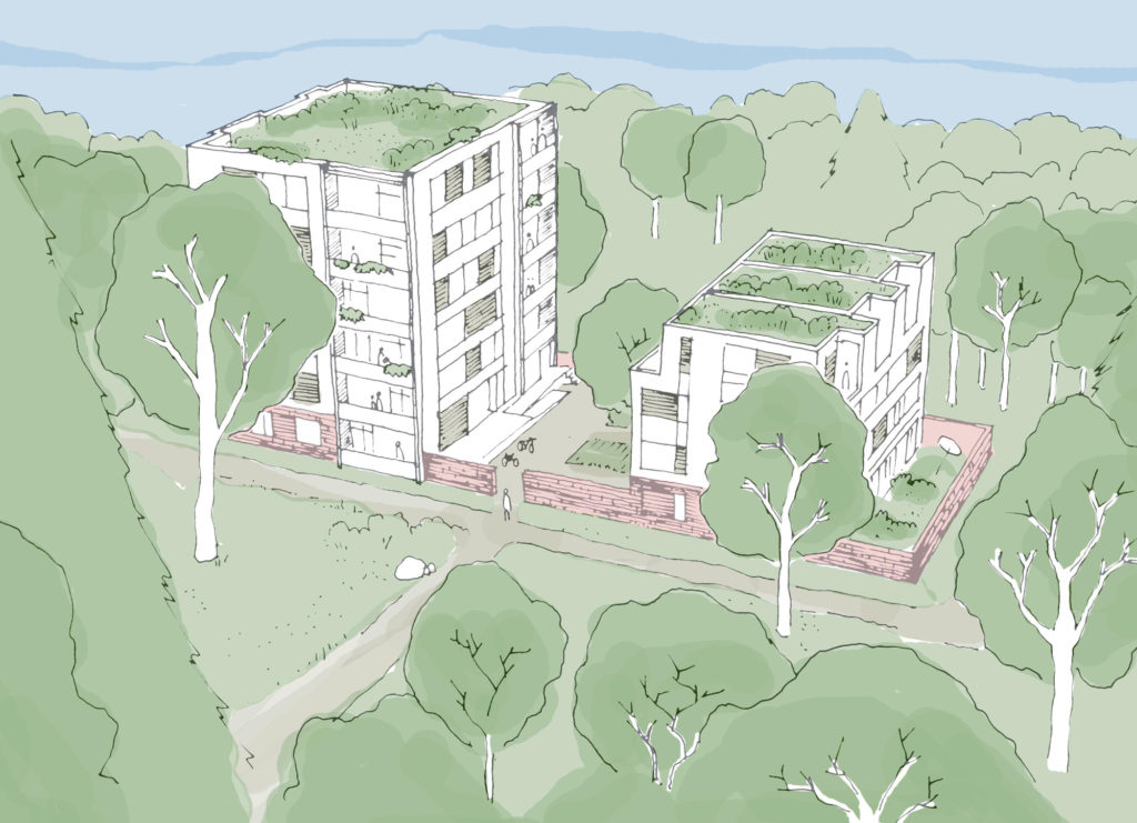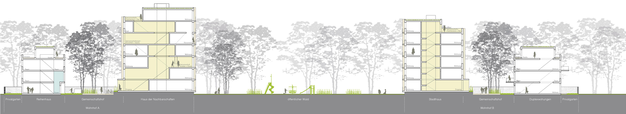 Das neue Quartier entwickelt eine innovative, ortsspezifische, prägende Struktur, welche sich in den Reigen der unterschiedlichen, aber jeweils sehr markanten Baustrukturen der Umgebung eingliedert. Die aufgelockerte Bauweise respektiert den wertvollen Baumbestand und schafft gleichzeitig ein einmaliges Wohnerlebnis „im Wald“ in urbaner Lage.