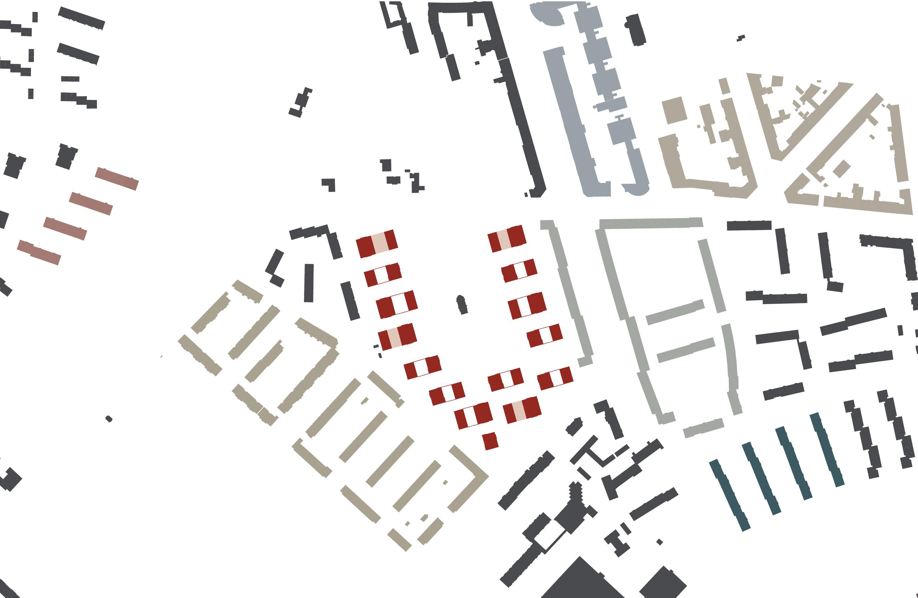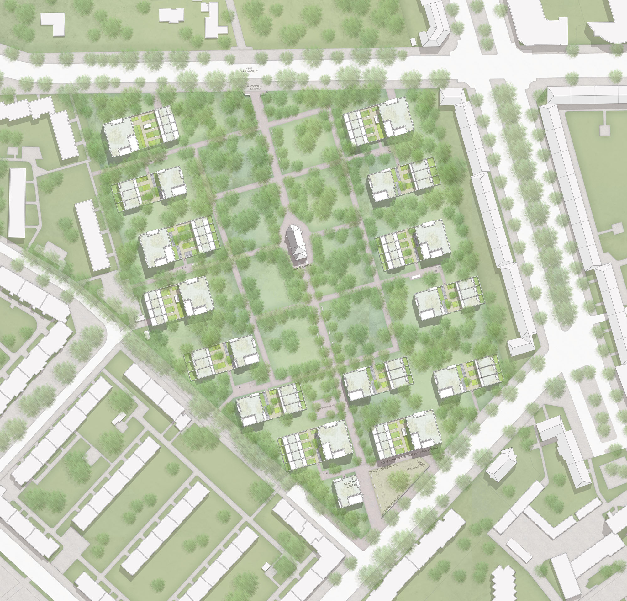 Die umliegenden Stadtgebiete, wie auch das Englische Viertel, sind durch kleine Einheiten differenzierter Baustrukturen bzw. Wohnquartiere geprägt, wodurch sich ein „Flickenteppich“ aus verschiedenen Stadtbausteinen und Grünräumen ablesen lässt. Das neue Quartier am Friedhof fügt sich behutsam in diesen Kontext ein und stellt bewusst eine weitere eigenständige Siedlungsstruktur innerhalb des baustrukturellen „Flickenteppichs“ dar. Dadurch bleiben die geschützten Bestandsquartiere als solche eindeutig ablesbar. Das Aufgreifen übergeordneter Entwurfsideen bzw. -elemente – z.B. Material Mauerwerk/Putz, Fassadengliederung, Gemeinschaftsanlagen etc. – schafft trotz baustruktureller Eigenlogik eine gute Vernetzung und Einbindung in den Kontext.