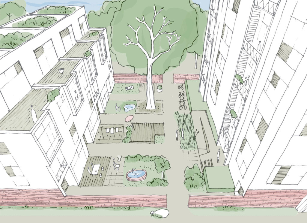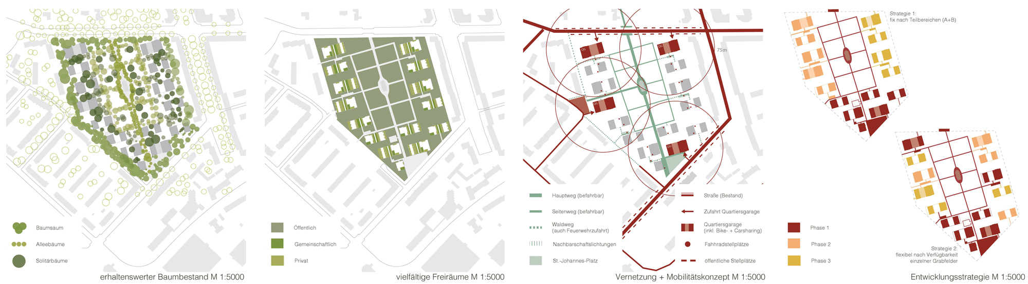 Das städtebauliche Grundgerüst orientiert sich neben dem baulichen Umfeld stark am vorhandenen Baumbestand. Einzelne Wohnhöfe in Form von Baufeldern, welche frei im öffentlichen Friedhofswald liegen, bilden die städtebauliche Grundidee. Diese Wohnhöfe liegen im Bereich der ehemaligen/derzeitigen Grabfelder und somit zwischen den wertvollen Alleen.