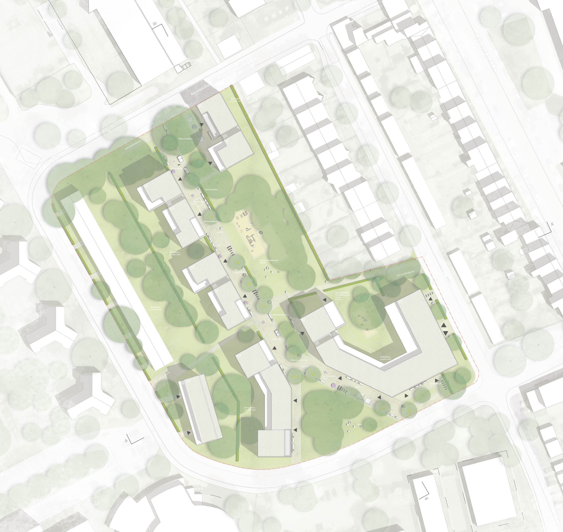 Die behutsame Setzung der neuen Baukörper gibt den Beständen an der Arminiusstraße und am Gallierweg ein neues Rückgrat in Form der zentralen Quartiersachse und ihrer begleitenden und zu ihr adressierten Gebäude. Von Süden her entsteht durch das Freistellen der Baumbestände und die Aufnahme der Ausrichtung des Bestandsgebäudes ein begrünter Quartiersauftakt, der selbstverständlich in das Innere mit dem Spielwäldchen und der Quartiersachse leitet.