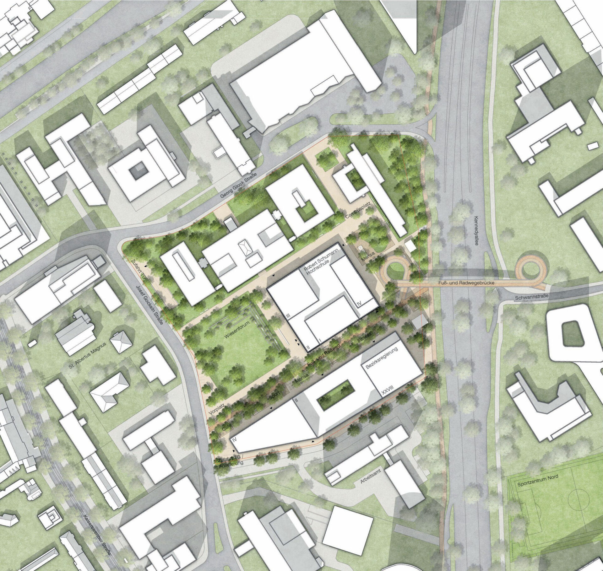 Die Grundstruktur des Entwurfes wird geprägt durch den großzügigen Freiraum vor dem neuen Hochschulgebäude. Dieser öffnet das Quartier in Richtung Westen und bietet somit einen attraktiven Anknüpfungspunkt ins bestehende Quartier hinein. Als Ankommensort für Besucher*innen und Studierende empfängt der grün und versiegelungsarm gestaltete Platz die Menschen kommend aus der Nachbarschaft, von der Stadtbahnhaltestelle oder aus Richtung des Rheinufers. Der Entwurf ist somit bewusst nicht in Richtung der stadträumlich unattraktiven MIV-Achse Kennedydamm orientiert, sondern sucht seine Anknüpfung an den gebauten Stadt- und nicht an den Verkehrsraum. Die Ausrichtung der neuen Gebäude folgt ebenso den Richtungen und Linien des umgebenden Quartiers.