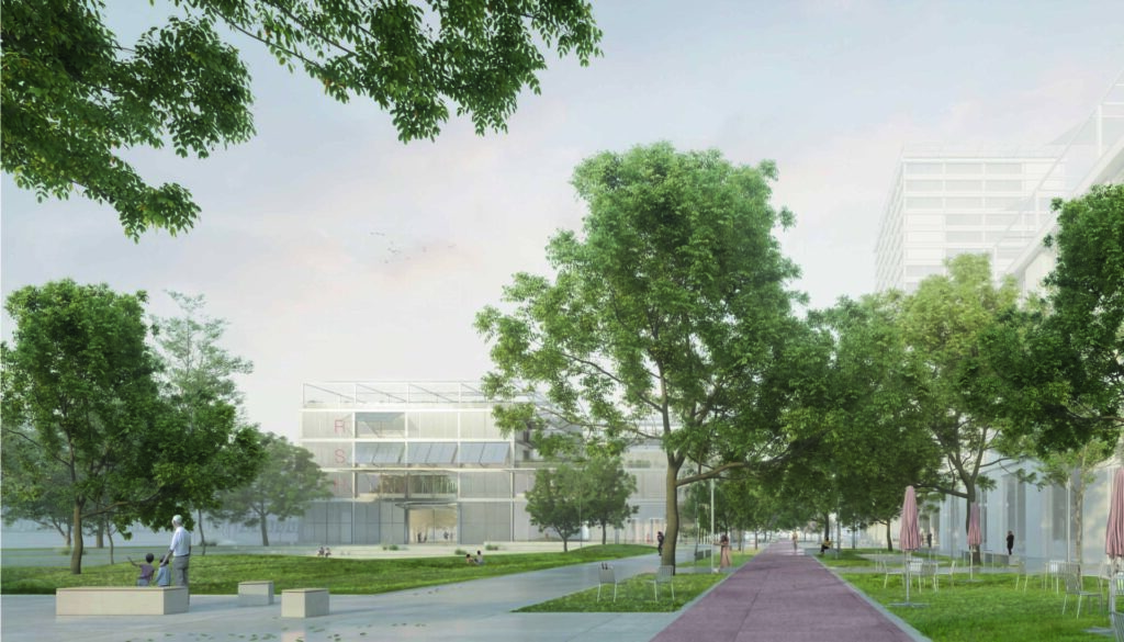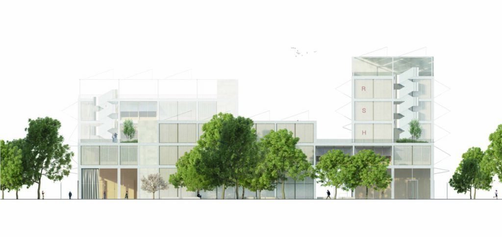 Die vorgeschlagene Bebauung wandelt den bis jetzt geschlossenen und seine Umgebung ignorierenden Hochschulstandort zu einem offenen, einladenden und vernetzten Campus. Der zentrale Baukörper des Hochschulneubaus steht losgelöst als dominanter Solitär auf dem Campus und verbindet in seinem Scke