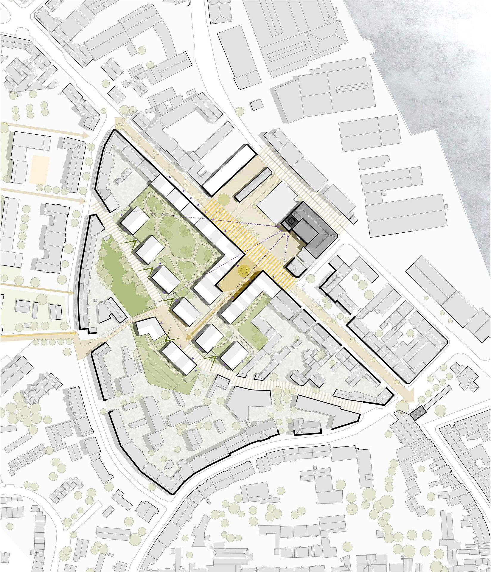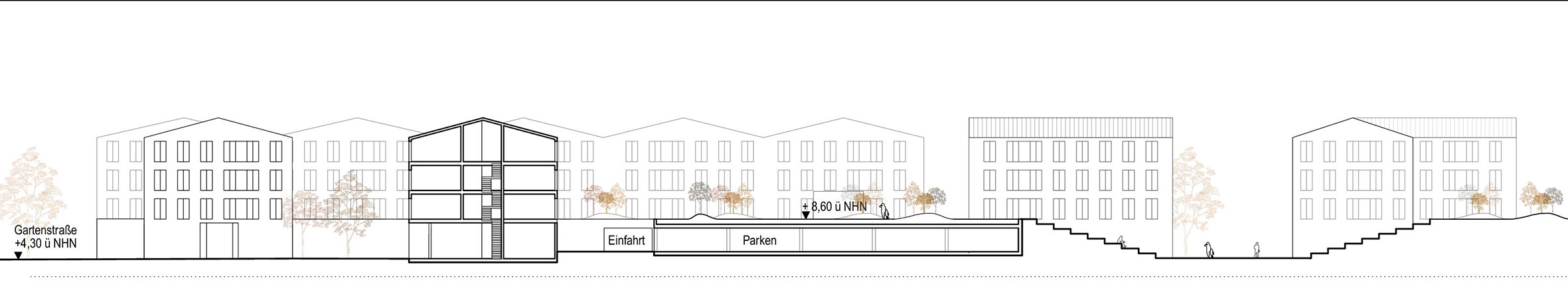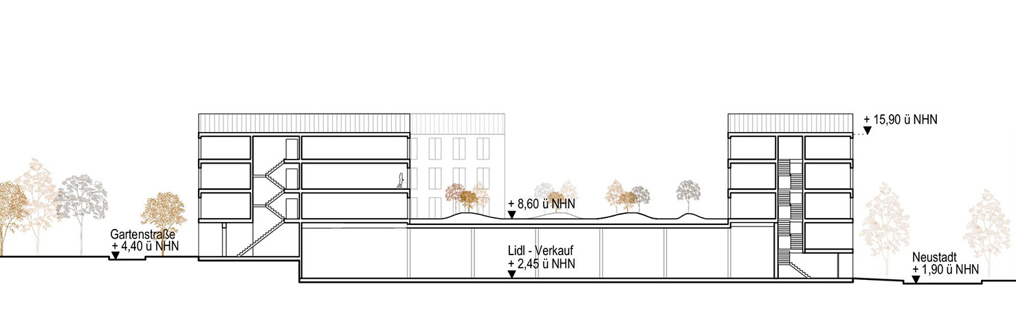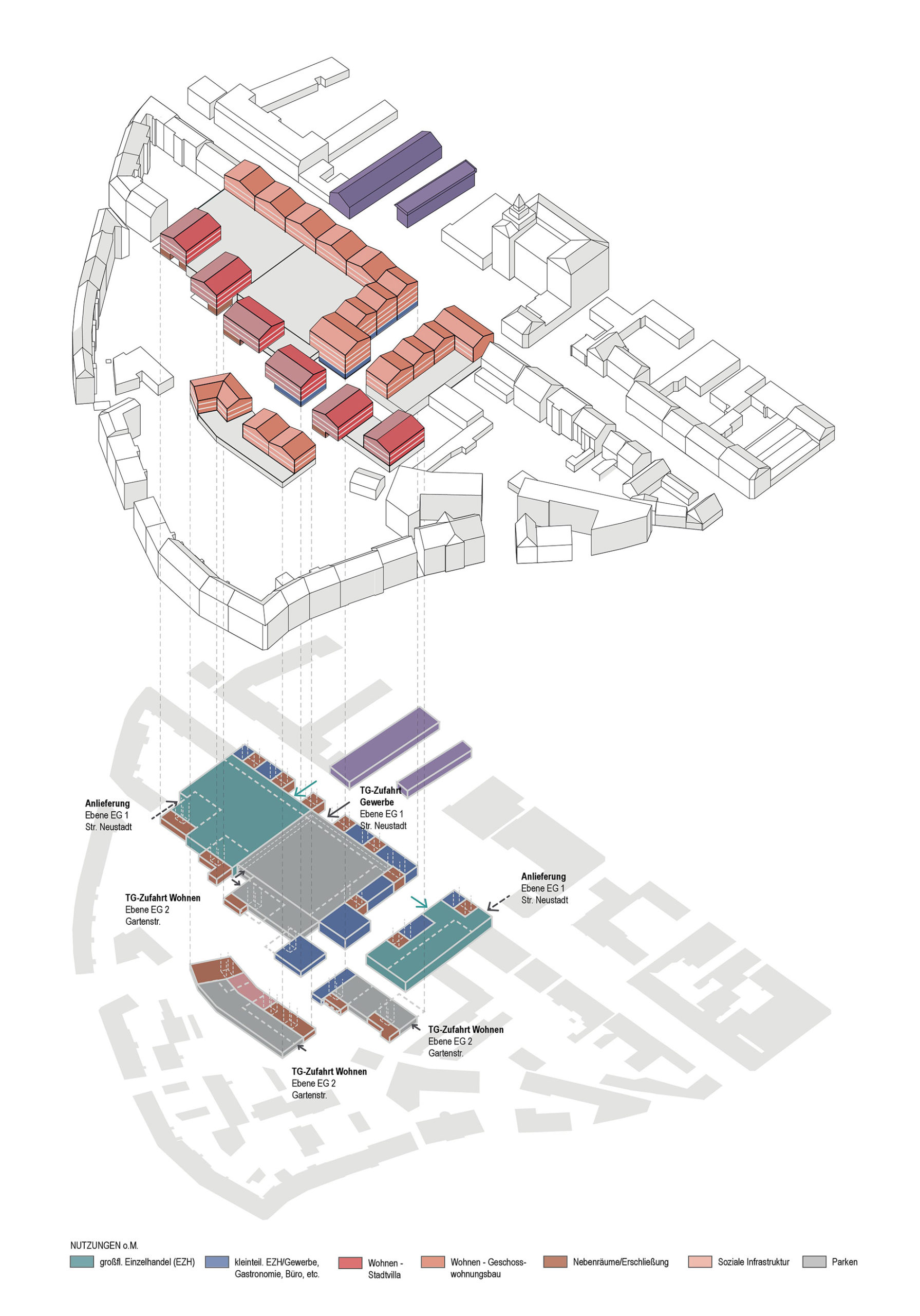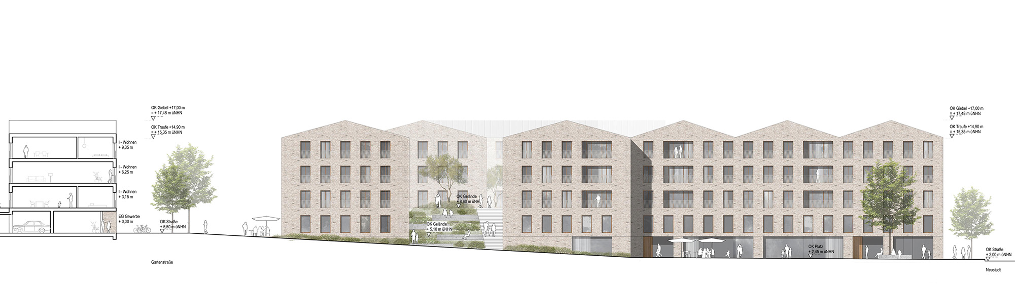 Die Unterschiede der das Gebiet begrenzenden Straßen Gartenstraße und Neustadt werden herausgearbeitet, ergänzt und zu einem neuen Stadtbaustein mit abwechslungsreiche Raumsituation und Wahrnehmungen zusammengefügt.