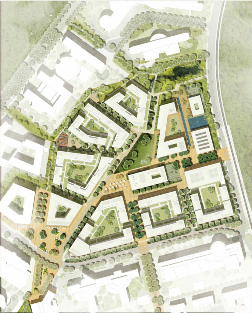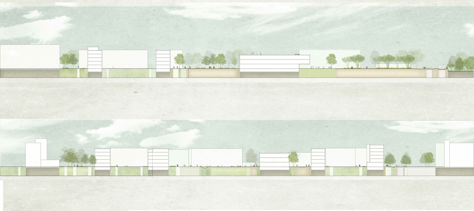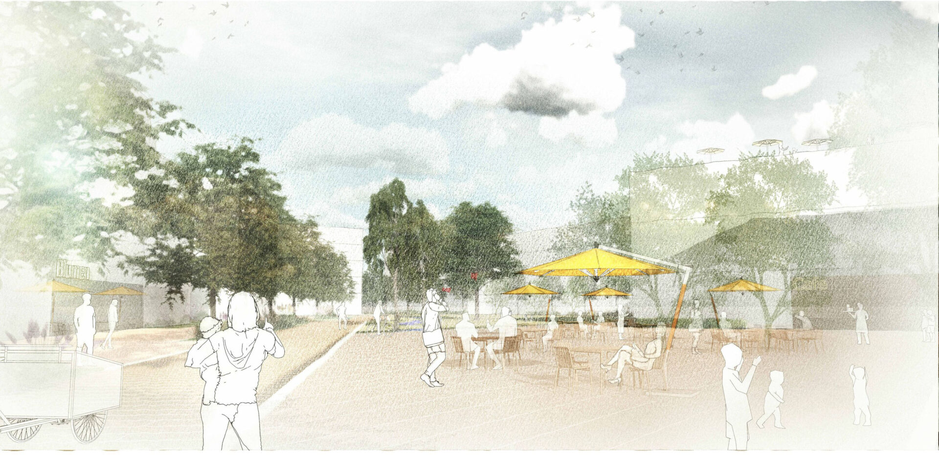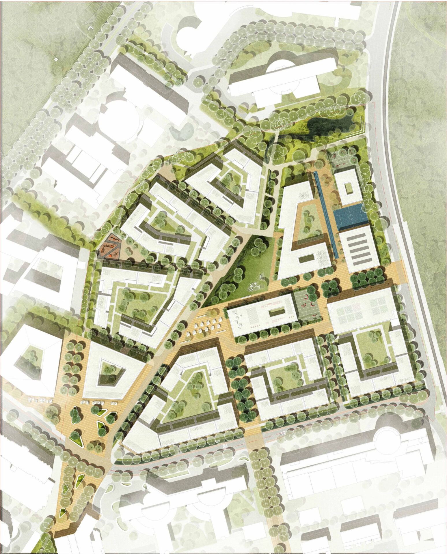 Mit gezielten punktuellen baulichen Ergänzungen setzt der Entwurf auf eine Stärkung seiner räumlichen Qualitäten unter Einbeziehung der flächenhaften Stellplatzanlagen. Bestehende Freiraumbezüge und fragmentierte Freiraumelemente werden gestärkt und zu einem engmaschigen, konsistenten und vielfältigen Freiraumsystem verwoben.