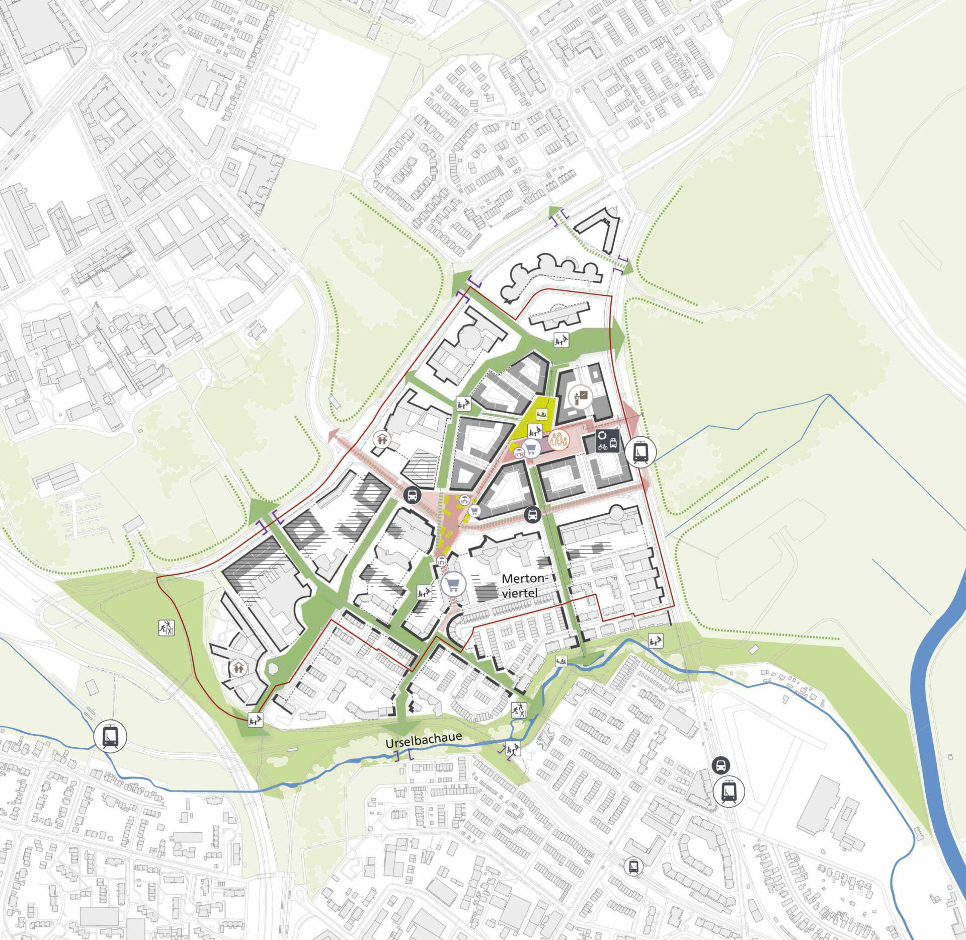 Für das Mertonviertel schlagen wir ein umfassendes Upgrade im Sinne eines zeitgemäßen green urbanism vor. Wir sehen heute ein vom Auto dominiertes, funktionalistisch sortiertes und räumlich weitgehend unbefriedigendes Konglomerat ohne große städtische Qualitäten. Mit dem neuen Lurgi erhält das Viertel nun einen bunt gemischten und kompakten Kern. Mit einer begleitenden Interventionsstrategie wird das „alte“ Merton in vielen kleinen Schritten in eine neue Qualität gebracht. In dieser spezifischen Mischung aus Neu und Alt werden wir eine eigenwillige Form der Stadtwerdung beobachten können. Den Merton-urbanism.