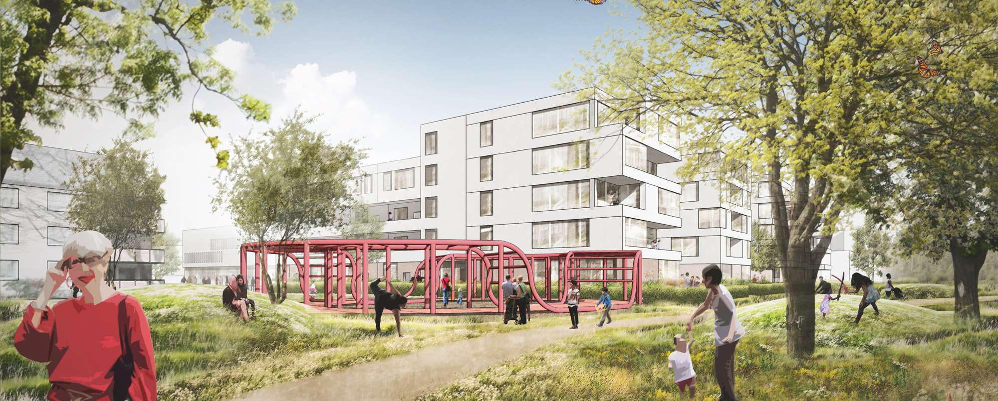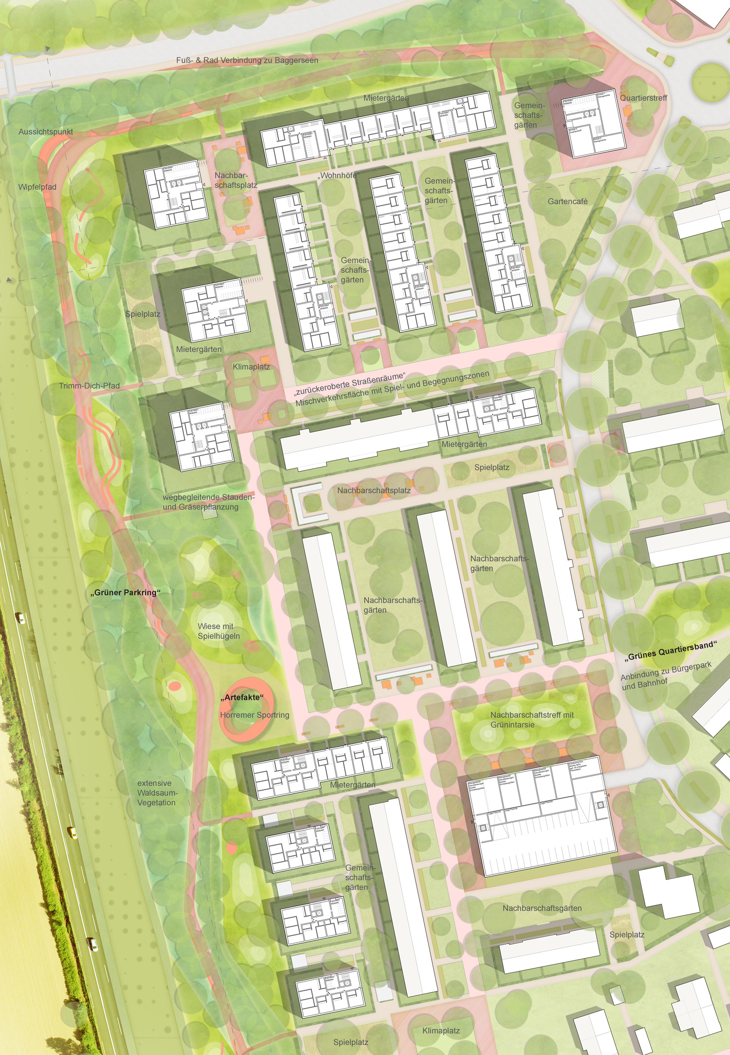 Das Quartier zeigt sich in einem neuen grünen Gewand: Ein Parkring spannt sich um das Quartier und verleiht dem Stadtteil eine klare und attraktive Gestalt. Der Grüne Ring greift das Potential bereits vorhandener Gehölzsäume und Grünstrukturen auf und verwandelt es in zusammenhängende, nutzbare Freiräume. Durch ein umlaufendes Wegenetz wird ein über 3 km langer Rundweg erschaffen – ein Anziehungspunkt für Sportbegeisterte und Erholungssuchende aus der ganzen Stadt.