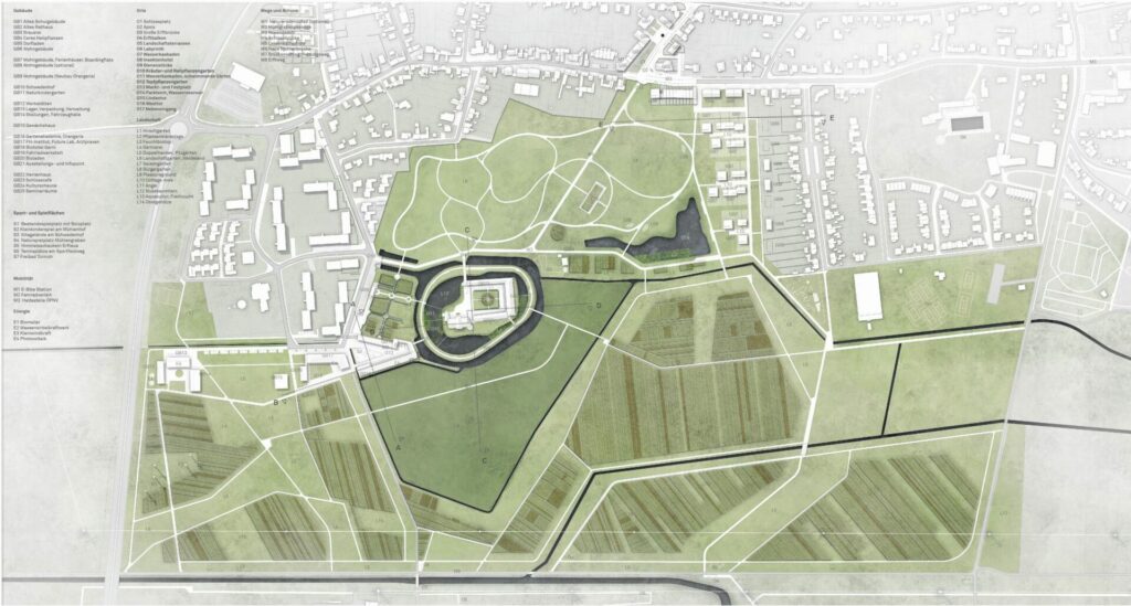 Im Mittelpunkt des Projektes steht zunächst den Ansatz der Schlossherren, um die Keimzelle des Schlosses eine zukunftsfähige, an den Prinzipien der Permakultur und Kreislaufwirtschaft orientierte Form des Landbaus zu etablieren. Das Zentrum bildet dabei eine symbiotische Verzahnung vergesellschafteter Nutzpflanzenkulturen mit gehölzbestandenen Weideflächen die sich als schalenartige Ringe rund um die Naturzelle des Hirschparks legen.