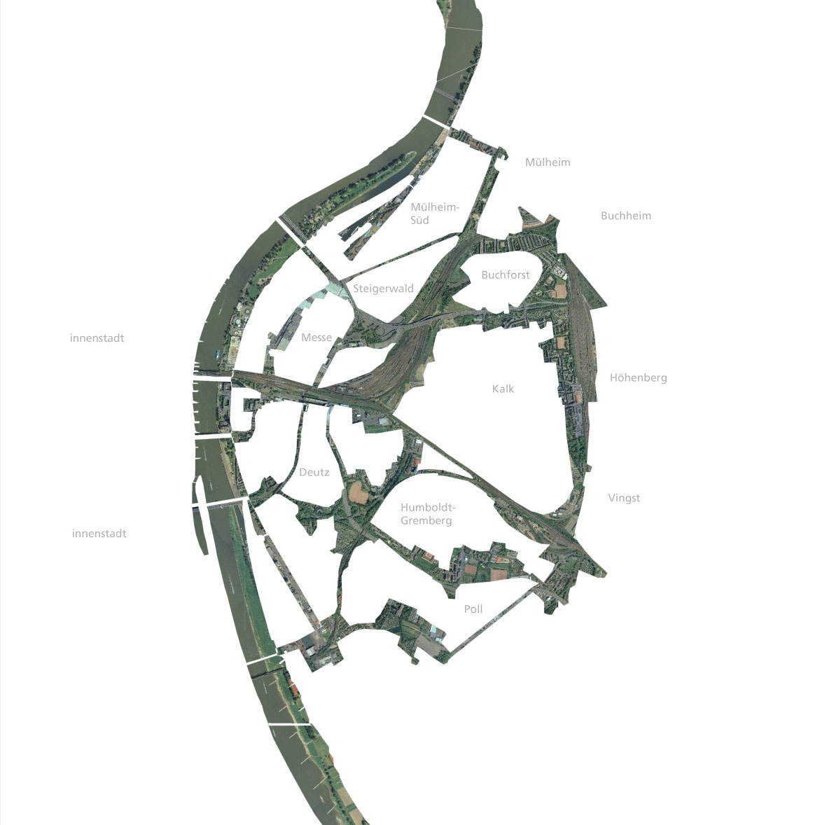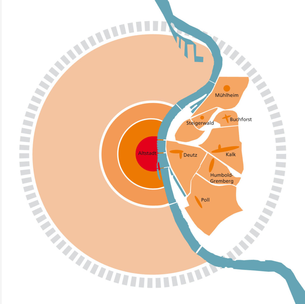 Das Rechtsrheinische ist in der besonderen Lage, seine großen Flächenpotentiale entlang der Trassen als eigenständiges, verbindendes Element gegenüber der linksrheinischen Kernstadt zu entwickeln. Alternative Verkehrsmittel, landschaftlich gestaltete Verbindungen und lebendige Stadtquartiere machen das Rechtsrheinische zu einem wertvollen Pendant zur linksrheinischen Innenstadt, die sich gemeinsam auf gesamtstädtischer Ebene in ihren Funktionen ergänzen.
