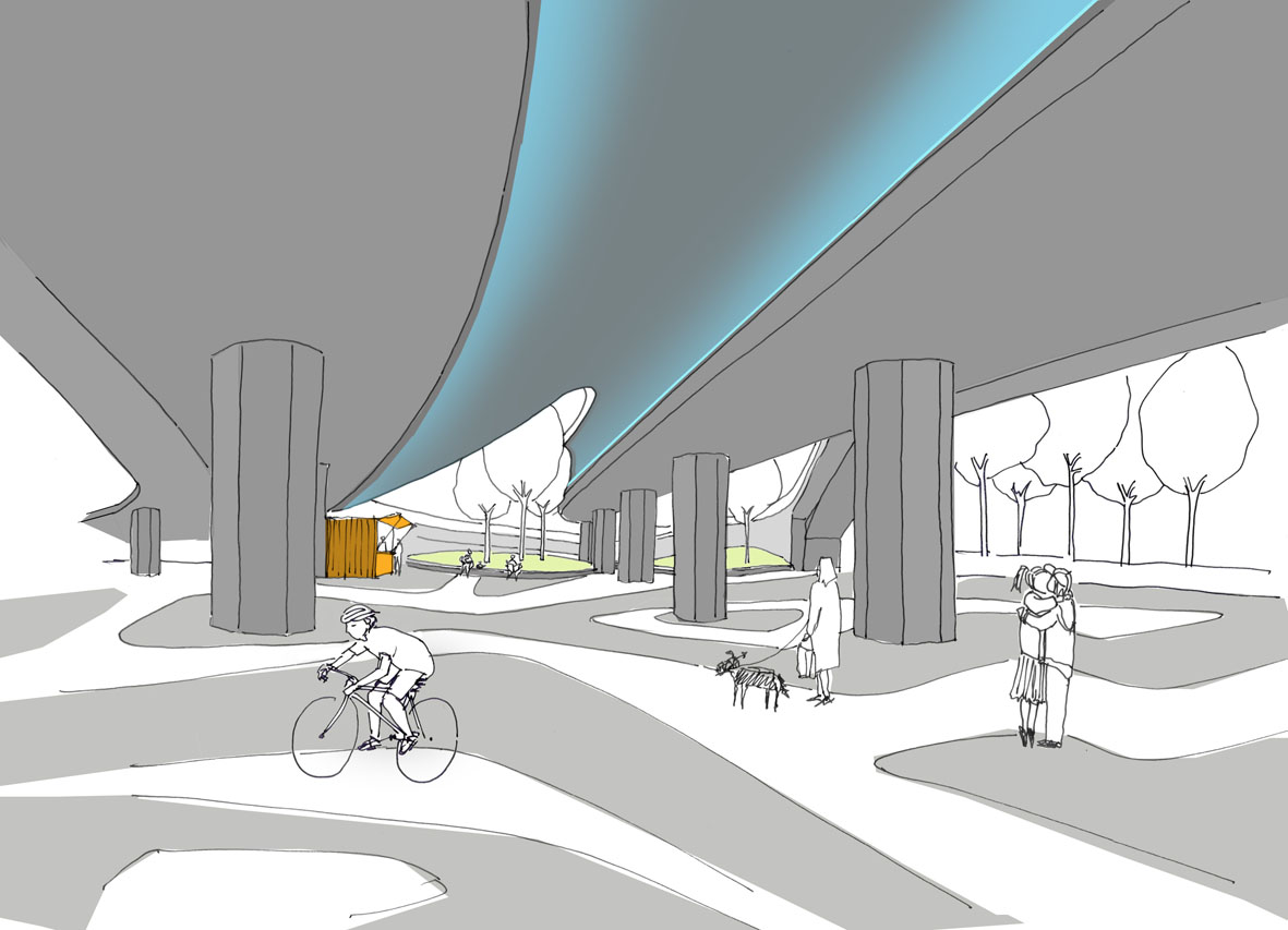 Die Gestaltung der Trassen als verbindende Stadtelemente ermöglicht eine Qualifizierung der Stadtstruktur des Rechtsrheinischen, die eine eigenständige Identität aufweist.